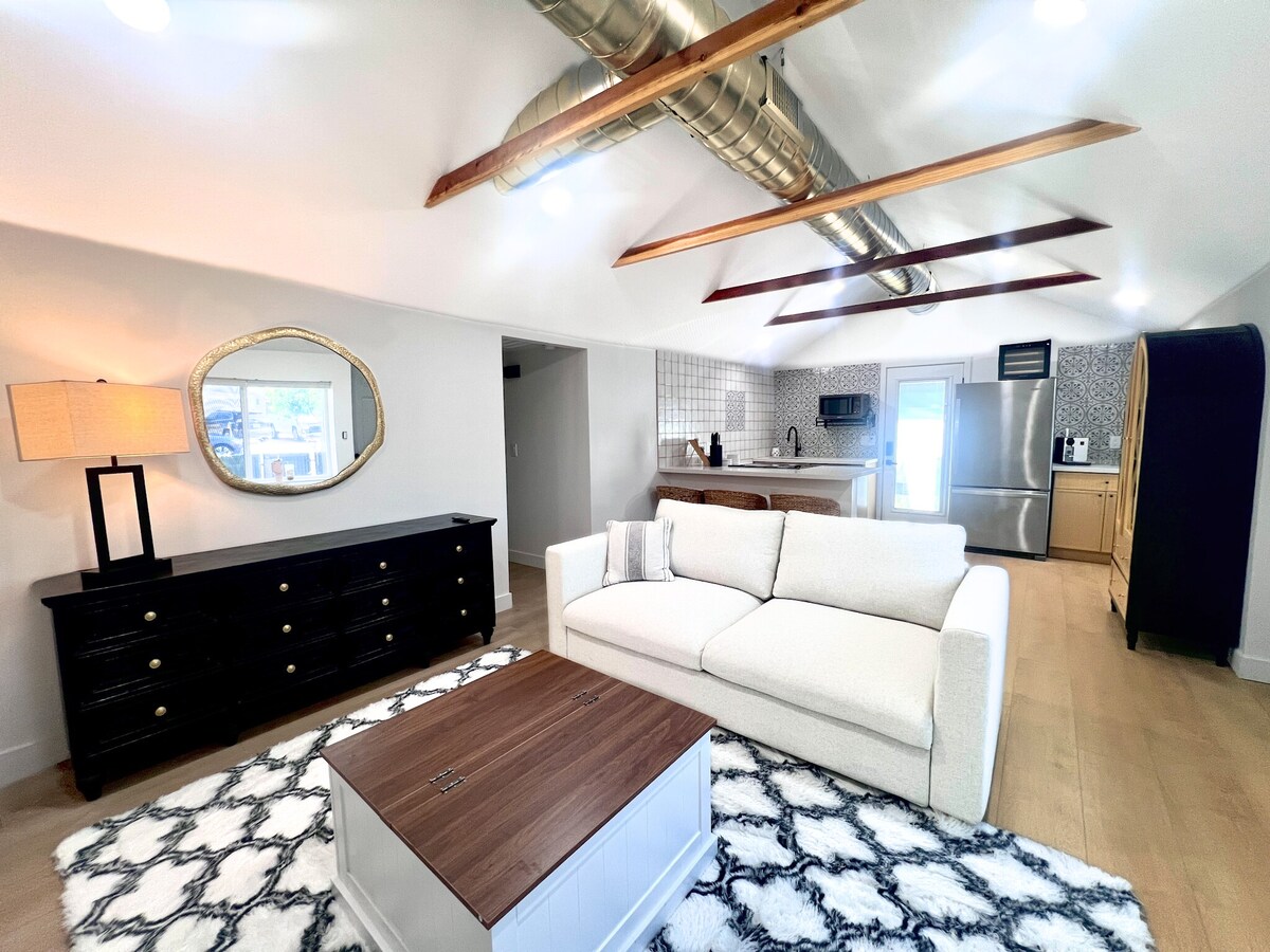 **Nous sommes également ouverts aux locataires à plus long terme, envoyez-moi un message pour plus d'informations** Casita entièrement meublée avec 1 lit/1 salle de bain et un lit Queen Size. Le salon peut accueillir plus de monde car le canapé et la causeuse s'inclinent tous les deux complètement (voir photos). La porte d'entrée est sans clé pour une arrivée autonome. Profitez de l'accès à la cour avant partagée, aux parcs avec aires de jeux pour enfants et aux courts de tennis (tous accessibles à pied). Idéal pour les couples ou les voyageurs d'affaires. Proche des commerces, des restaurants et de l'accès facile à l'autoroute.
