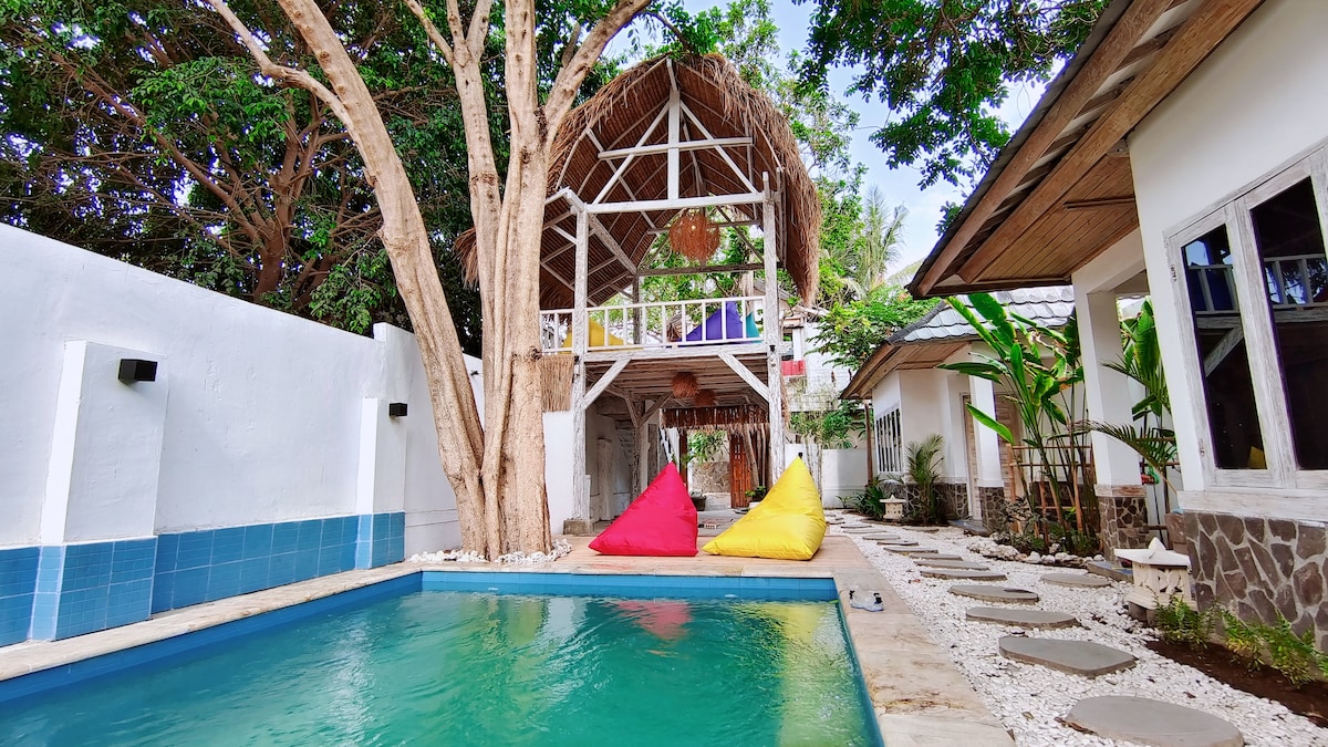 Paradis naufragé pour les vagabonds bohèmes et leurs petits. Situé sur le versant nord du boulevard au coucher du soleil, vous trouverez notre sanctuaire caché. Petit déjeuner, thé et café inclus tous les jours. Notre piscine fait partie des plus grandes piscines des Gilis et la salle de cinéma/jeu en bambou est parfaite pour les enfants. La chambre Deluxe est parfaite pour les voyageurs qui veulent et ont besoin d'un lit King Size de luxe pur, inclus dans l'option.