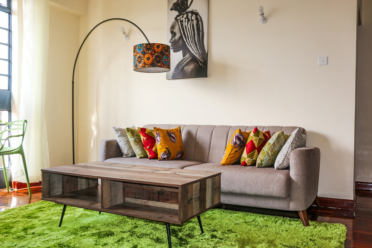 Notre appartement paisible et familial de deux chambres est moderne et élégant, et il est situé à Mi Vida Homes - Garden City Mall, à la sortie 7 Thika Road. Mi Vida est un endroit parfaitement serein où séjourner en vacances, en travaillant ou en tant que maison, avec des espaces verts bien entretenus et des jardins de fleurs paysagers colorés. La piscine et la salle de sport équipée vous aident à rester en forme et à vous détendre, avec un patio extérieur pour vous détendre ou organiser un barbecue. Il offre un accès facile au quartier des affaires de Nairobi et à l'aéroport JKIA.