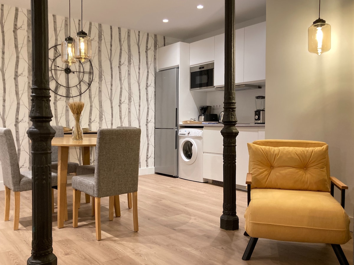 Magnificent 45 square meter apartment in the heart of Madrid. With spectacular design and decoration, spacious areas, and high ceilings, the apartment is equipped with everything you need for your stay in Madrid. The living room has three balconies overlooking the street that provide great brightness to the flat. The bedroom has an en-suite bathroom and a work desk. From the apartment, you can walk to almost all the iconic points of Madrid.