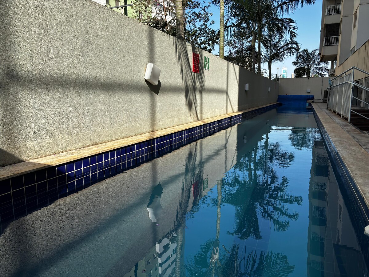 Appartement 2Q - PRÈS DE ORION - HÔPITAL ALBERT EINSTEIN Détendez-vous avec toute la famille dans ce logement calme. -enregistrement avec clé électronique, Smart TV, concierge 24h/24 - quartier le plus noble de Goiânia, à 1 km de Goiânia Shopping et Vaca Brava -02 places de parking (tiroir) - accès gratuit à la piscine chauffée, - youtube premium, Wi-Fi, Netflix, TV 4k, linge de lit et de bain. Il est nécessaire d'apporter des articles d'hygiène personnelle.
