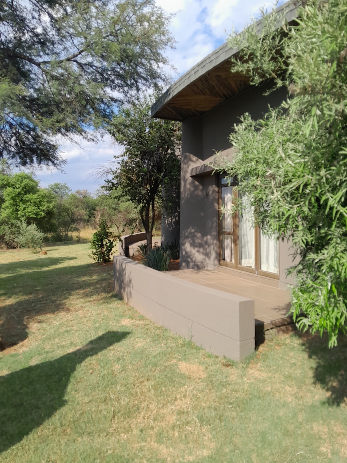 Ce Chalet fait partie de notre nouveau logement. Privé et idéal pour les voyageurs qui passent la nuit et qui assiste à des réceptions sur place, il dispose d'un lit double et d'un autocar gigogne pour les enfants. WC et douche séparés avec lavabo. Belle vue sur le bushveld.