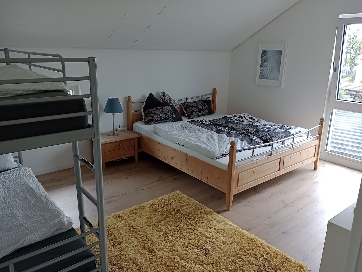 Nous louons notre spacieuse chambre d'hôtes non-fumeur dans le toit nouvellement aménagé de notre maison, avec antichambre, douche/WC, télévision par câble, kitchenette (bouilloire), machine à café, micro-ondes et petit réfrigérateur. Nous mettons à disposition de la vaisselle, mais il n'est pas possible de cuisiner. Convient pour jusqu'à quatre adultes, lit bébé possible sur demande. Commerces, piscine Titania et transports en commun à proximité.