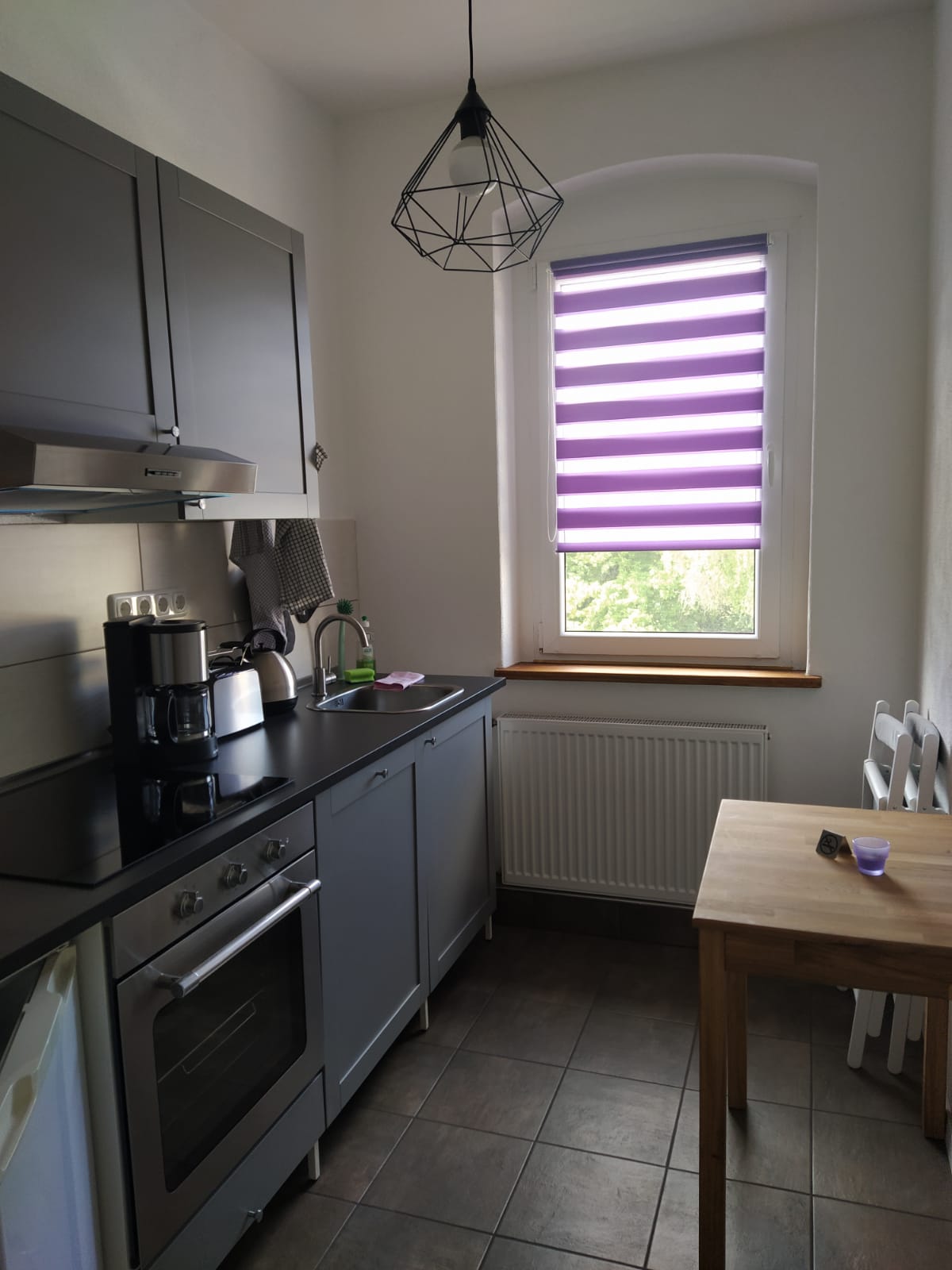 Appartement de 30 m ² dans une maison mitoyenne rénovée Zone d'entrée Pièce principale lit de 1,60 m, canapé (avec fonction de couchage de 1,30 m de large), table à manger exécutée comme buffet Cuisine entièrement équipée (appareils haut de gamme, café, thé, chocolat à boire gratuit) en face de la double vasque à gauche, entrée de la douche de pluie ouverte à droite des toilettes (porte verrouillable) el. Volets roulants pièce principale & toilettes Stores plissés sur toutes les fenêtres Le véhicule(s) peut être (s) garé directement devant la propriété (impasse) ! Cour pas encore rénovée
