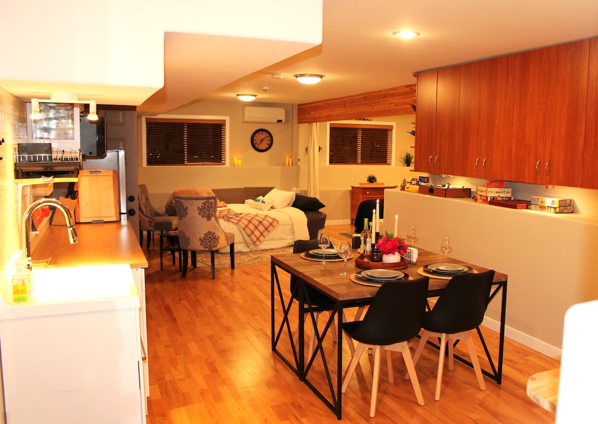 Cette suite peut accueillir de 1 à 4 personnes : 1 000 pieds carrés avec entrée privée. Séjour avec télévision connectée UHD de 49'. Coin repas avec quatre places assises. Cuisine entièrement équipée avec cuisinière, réfrigérateur, micro-ondes, grille-pain, bouilloire et cafetière. La salle de bain dispose d'une douche dans la baignoire, de toilettes et d'un lavabo. Il s'agit d'une suite en bas avec beaucoup de hauteur, sauf si vous êtes extrêmement grand. Du sol au plafond il y a 6 pieds 9 3/4 pouces, où une poutre de soutien traverse le plafond où la hauteur libre est de 6 pieds 2 pouces.