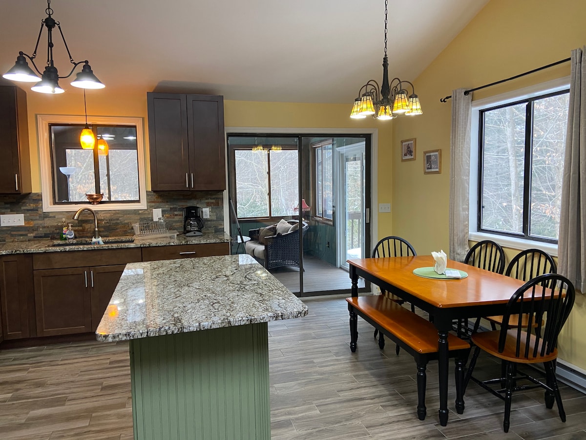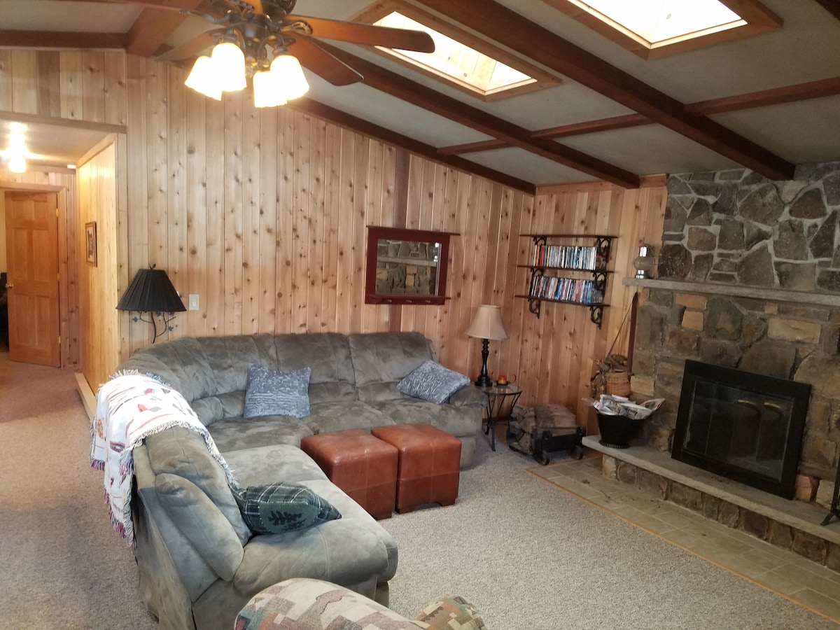 Plafonds voûtés, cheminée dans le séjour, 2 chambres au premier étage dans ce chalet 4 saisons aéré et privé avec accès facile aux commodités de la région. La maison est à quelques minutes à pied de la piscine intérieure (ouverte de la fête du Travail au jour du Souvenir), et à seulement une rue d'un magnifique parc d'État avec plus de 2 000 acres à explorer avec des sentiers et un lac de 250 acres avec plage de sable. La piscine extérieure, les plages, les courts de tennis et plus encore sont ouverts du Jour du Souvenir à la Fête du Travail. 3 pistes de ski sont à moins de 30 minutes.