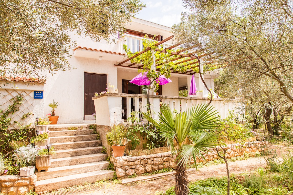L'appartement de 25 m2 peut accueillir confortablement une famille avec 2 enfants et offre un confort spécial aux couples. Il se trouve seul au milieu d'un jardin familial dans un environnement verdoyant. À côté de la cour, il y a une terrasse supérieure avec vue sur la baie. Ce qui rend cet appartement idéal pour vos vacances est un environnement paisible, un sentiment d'intimité, et pourtant proche du centre de l'endroit. La climatisation et le WIFI(gratuits) sont disponibles. Les plages sont à quelques minutes à pied.