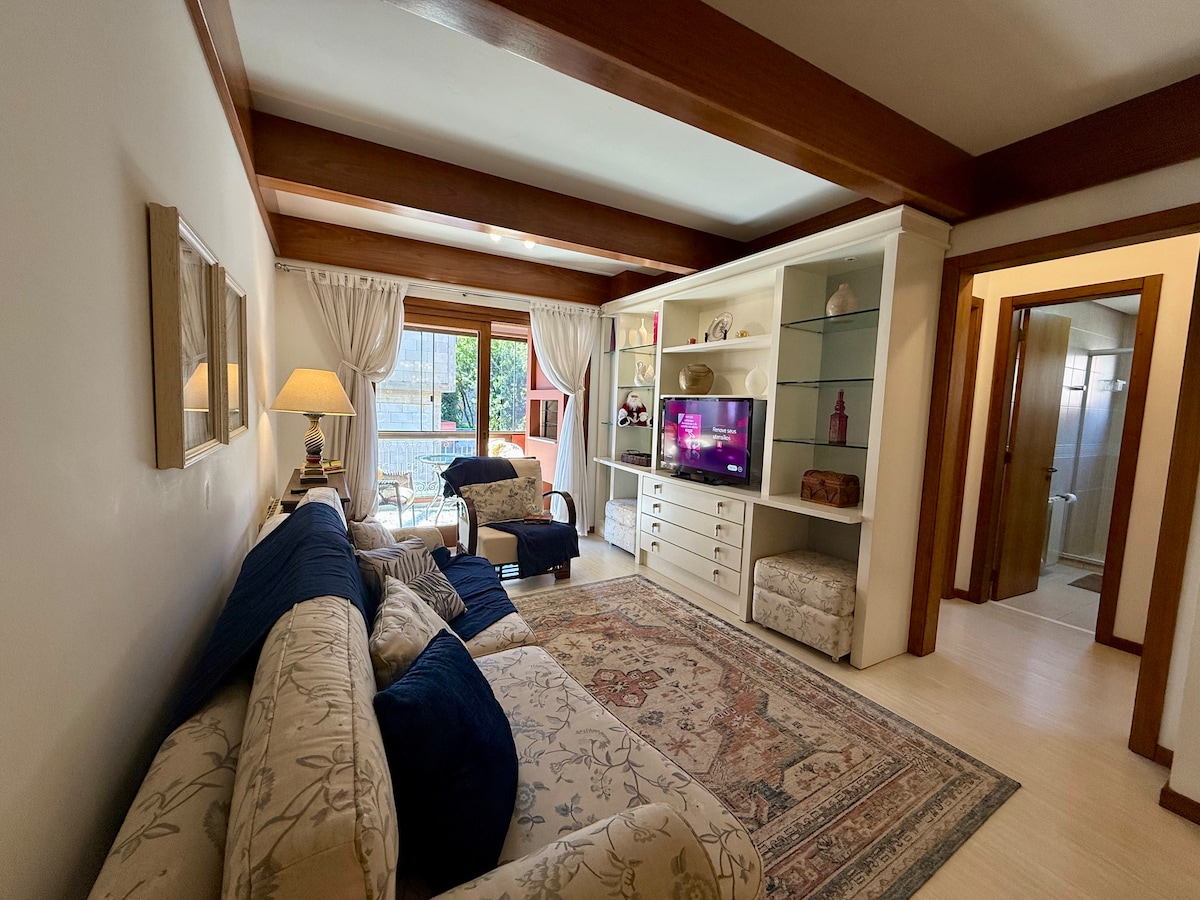 📍Located in the center of Gramado; close to the city's main restaurants, markets, and attractions; ✅ Safe and quiet space; 🛏️ Accommodates up to 4 people; 🛏️ 2 bedrooms with: 1 king-size bed and 2 single beds; 🚗 1 covered parking space; ❄️/☀️ 2 air conditioners (hot/cold) in the bedrooms; 📶 Fast Wi-Fi; 🍽️ Equipped kitchen; 🔥Barbecue grill; 🛌 We provide high-quality bed linens and towels; 🐶 Pets not allowed.