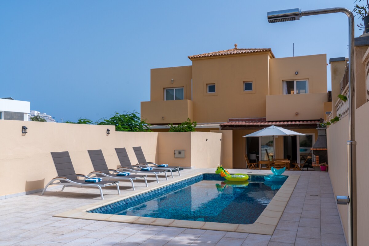 Villa indépendante avec piscine privée située dans un quartier calme de Grand Tarajal. Conçu pour les couples ou les familles qui souhaitent se détendre et débrancher. La Casa de Sol est une maison rénovée avec une piscine nouvellement construite, avec tout le confort nécessaire pour profiter de vacances agréables. Toutes les chambres sont très lumineuses et disposent d'une terrasse avec vue. Des textiles de qualité et un mobilier simple vous permettent de vous sentir comme chez vous. Présentation de la maison Le salon dispose d'un canapé, d'une télévision à écran plat, d'une connexion Wi-Fi gratuite, de deux salles de bains avec douche et d'une salle de bains entièrement équipée avec un sèche-cheveux. La grande chambre principale dispose d'une salle de bain avec douche et d'un lit double de 180 cm, un petit balcon avec vue sur les montagnes au loin; la deuxième chambre dispose d'un lit double, la troisième chambre dispose de deux lits simples, un balcon avec vue sur la mer; il y a une autre salle de bain avec douche au deuxième étage; adapté aux grandes familles. La cuisine américaine entièrement équipée comprend un coin repas, vous pouvez cuisiner à tout moment. Il est équipé d'un lave-vaisselle, d'un réfrigérateur, d'un four, d'une plaque de cuisson, d'un micro-ondes, d'une bouilloire, d'une machine à café, d'un mixeur et de tous les ustensiles de cuisine nécessaires. Cette maison dispose également d'une buanderie équipée d'un lave-linge et d'un fer à repasser. Et ce que nous aimons le plus ! La terrasse dispose d'une piscine d'eau de mer, d'une douche et d'une table à manger en plein air, d'un barbecue et d'un coin salon ombragé. Parking gratuit pratique Cette villa est idéale pour découvrir la vie espagnole de près. Vous y trouverez des bars, des restaurants, des supermarchés, des boutiques, des pharmacies, etc. ! Il y a une plage de sable noir juste devant la porte.