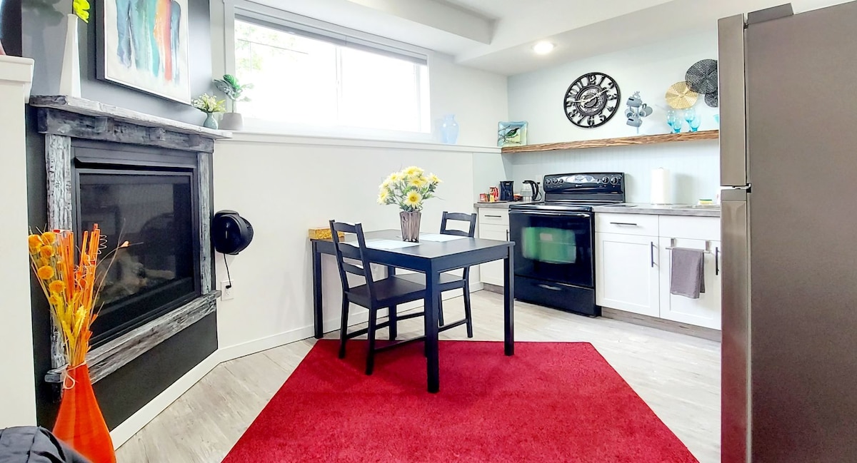 Échappez à la chaleur dans cette suite privée au sous-sol décorée avec goût. Deux chambres avec matelas confortables, couettes et oreillers en duvet. Cuisine équipée avec tout ce dont vous avez besoin pour cuisiner et manger un repas. Salon avec cheminée/chauffage et télévision 55”. Salle de bain avec une grande douche. Buanderie partagée à votre niveau. WiFi haut débit illimité, chaînes sportives, Netflix, Disney+, location de films et Pac-Man. Patio avec table et chaises, barbecue et jardin. Quartier calme à proximité des sentiers pédestres. Parking gratuit dans la rue.