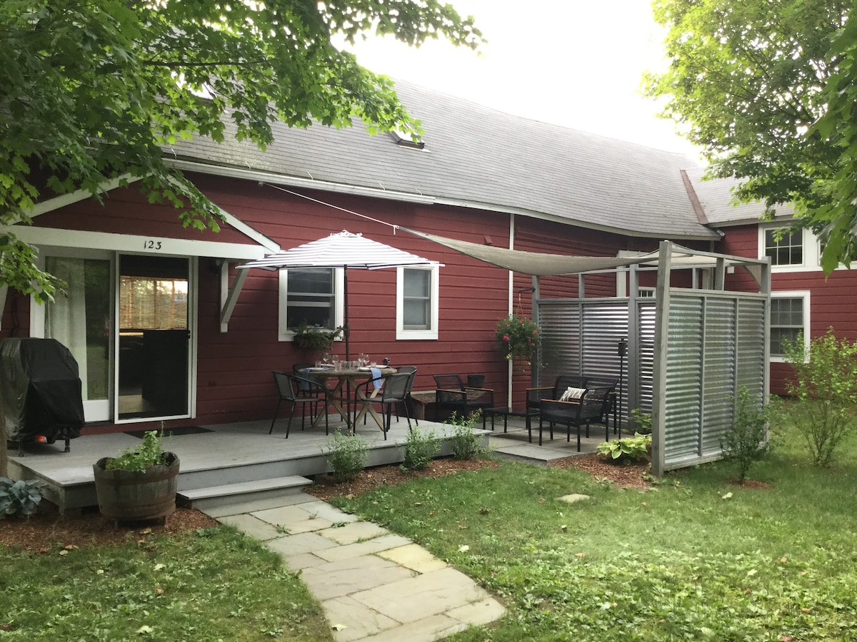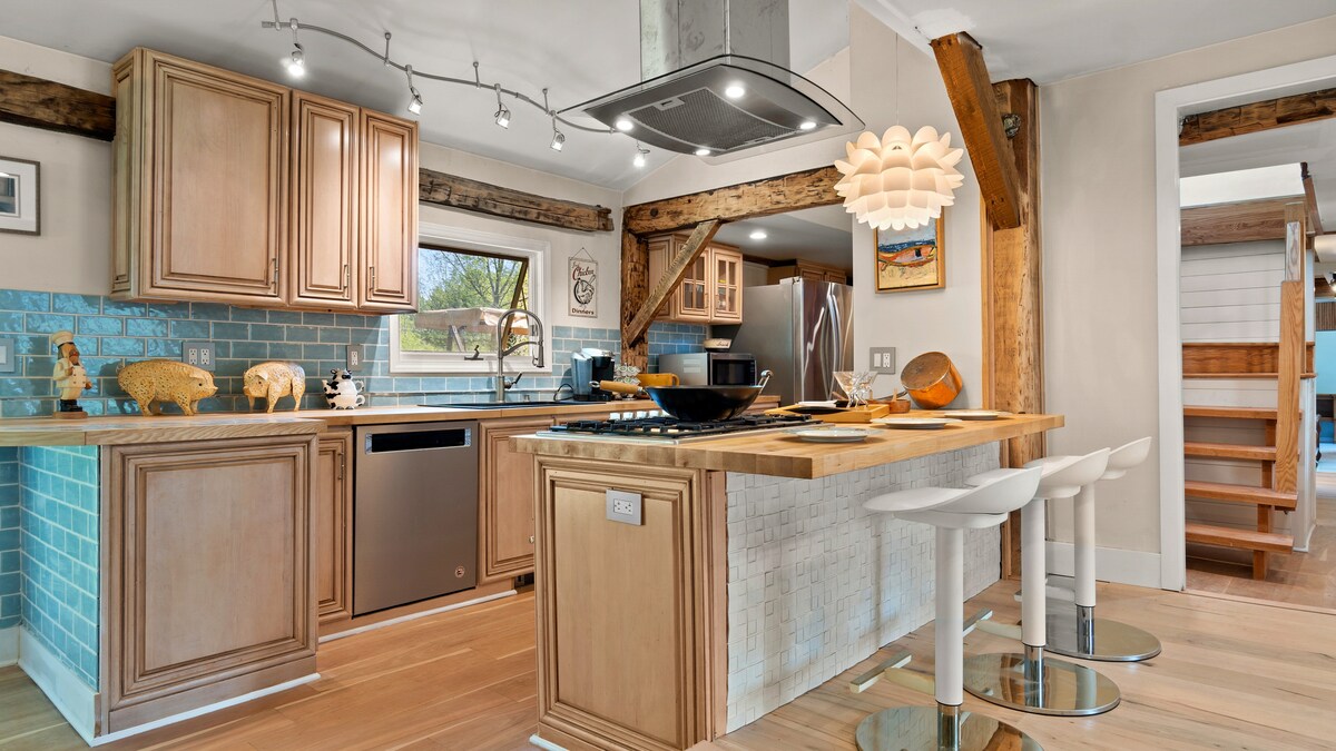 Maison confortable de 3 chambres (5 lits) et 2 salles de bain sur 4 acres privés dans la charmante ville de Ghent, New York. Récemment rénové, l'Arch Bridge Chalet offre un confort moderne et propre avec un plan d'étage ouvert, des salles de bains de luxe, des appareils et des ustensiles de cuisine haut de gamme, une cheminée à bois, une terrasse extérieure et des foyers. Entouré d'arbres, de sentiers et de ruisseaux, mais à proximité des fermes de la vallée de l'Hudson, des brasseries, du ski de Berkshires et de la ville animée d'Hudson. Parfait pour la randonnée, le vélo, le kayak, le ski et les escapades toute l'année.