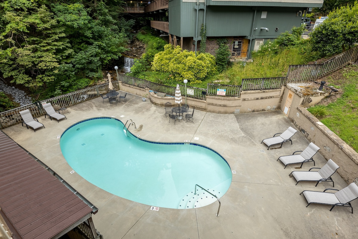 Découvrez le charme de ce magnifique appartement en copropriété redessiné, perché juste au-dessus du cœur du centre-ville de Gatlinburg, mais à quelques minutes à pied ! Profitez d'un lit king size luxueux avec salle de bain attenante, d'une kitchenette, de deux téléviseurs, du Wi-Fi et d'un espace de vie confortable avec cheminée. Détendez-vous au coin du feu, sirotez un café sur le balcon privé, faites une baignade rafraîchissante ou explorez les Smokies : à vous de choisir ! Et chut... n'oubliez pas notre escalier privé « secret » menant au centre-ville, ce qui vous permet de gagner du temps, d'éviter les tracas et les frais de stationnement !