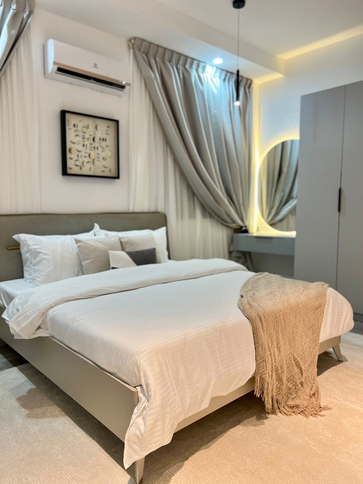 L'Avery Loft Apartment est un appartement moderne de 1 chambre et 1 salle de bain avec cuisine équipée, ustensiles et machine à laver. L'appartement est meublé avec goût, de grandes fenêtres en verre et des portes cèdent la place à la lumière naturelle brillante. L'espace est également livré avec des téléviseurs intelligents à écran plat, DSTV, WIFI, générateur d'énergie alimenté, salle de sport, système de purification de l'eau, nettoyage, sécurité et gestionnaire immobilier sur appel.