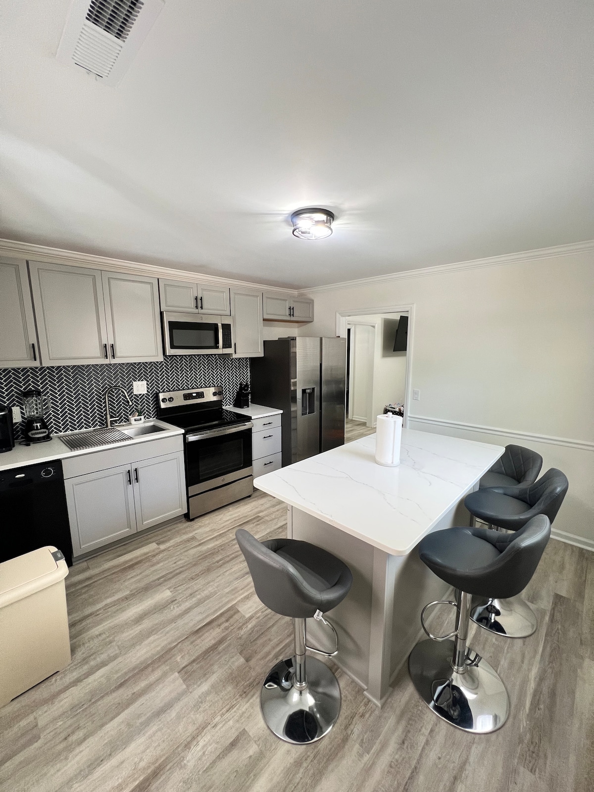 Starmount Forest est un quartier calme et haut de gamme au cœur de Greensboro. Situé à seulement un demi-mille des restaurants et boutiques haut de gamme du Friendly Center. Cette spacieuse maison de 2300 pieds carrés dispose d'un plan d'étage ouvert accueillant avec une grande cuisine, un bureau, un salon et une véranda. La cuisine est entièrement équipée avec des appareils en acier inoxydable et tout ce dont vous avez besoin pour cuisiner votre repas préféré. Nouveau mobilier partout, la salle de bain principale dispose d'une grande douche à l'italienne, et chaque chambre est équipée d'une télévision intelligente.