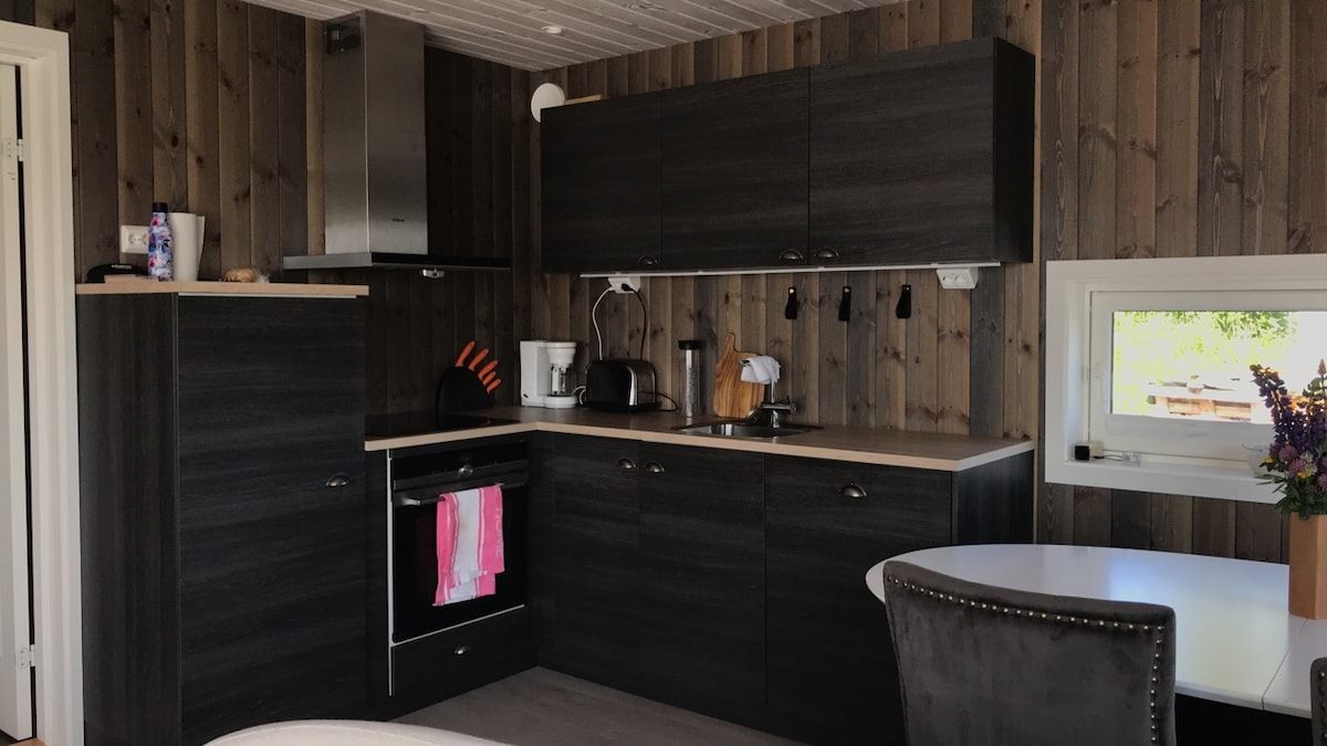 Hytta har 2 (3) soverom, (gangen mellom soverom og stue benyttes som soverom) 2 stuer, 1 bad, kjøkken, 3 dobbeltsenger og en enkeltseng. Hytta har alt av utstyr som oppvaskmaskin, mikrobølgeovn, vannkoker, kaffetrakter, vaskemaskin, ulike spill for barn og voksne, uteleker og inneleker. Hytta har utemøbler og bålpanne. Oppvarming varmepumpe og vedovn. Det er 7 dyner og puter tilgjengelig, sengetøy og håndklær må medbringes.