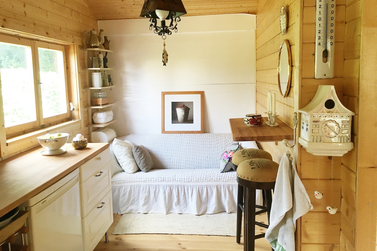 Cabine super détendue de 30 m² dans la nature à la lisière de la forêt, entre le lac Scharmützelsee et le lac Storkower, entourée d'un paysage varié. Notre Tiny House est non seulement romantique mais aussi moderne. Elle dispose d'un espace de vie ouvert avec kitchenette moderne, d'une chambre avec lit double confortable ainsi que d'une salle de bain avec douche spacieuse. Vivez des jours ou des semaines de détente et de silence, sur demande avec un chien, à proximité de Berlin.