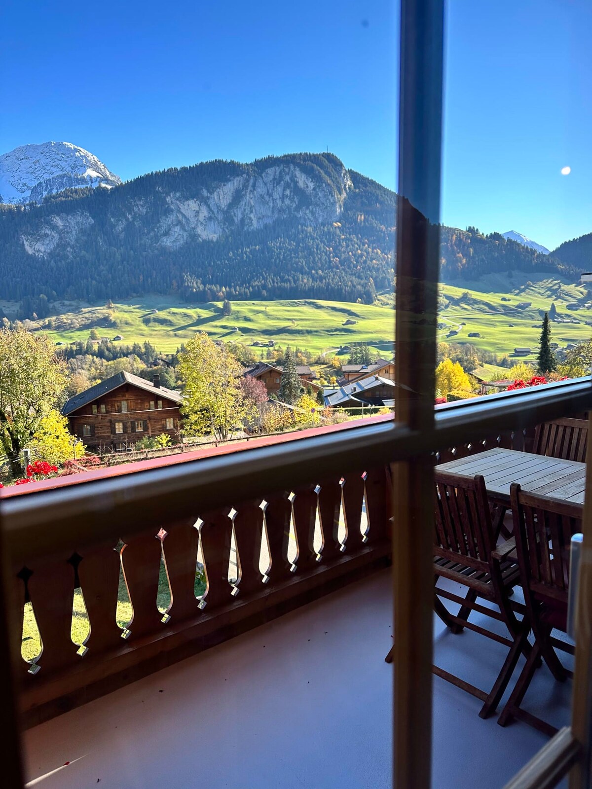Surplombant la vallée de Gstaad. Luxe face au sud du 19e siècle, appartement spacieux contemporain et bien équipé. Terrasse pour les repas en plein air. À 15 min en voiture de Gstaad, 1 h 45 de Genève. À 10 min à pied du centre-ville , du supermarché et de la gare. Piscine, sauna ,hammam, salle de sport, excellent ski. Un superbe domaine skiable, 250 km de pistes, 66 remontées mécaniques/câbles et pépinières. Piste la plus proche avec téléphérique à moins de 10 minutes en voiture , école de ski à 400 m. Glacier 3000 40 minutes en voiture généralement ouvert pour le ski de novembre à juin.