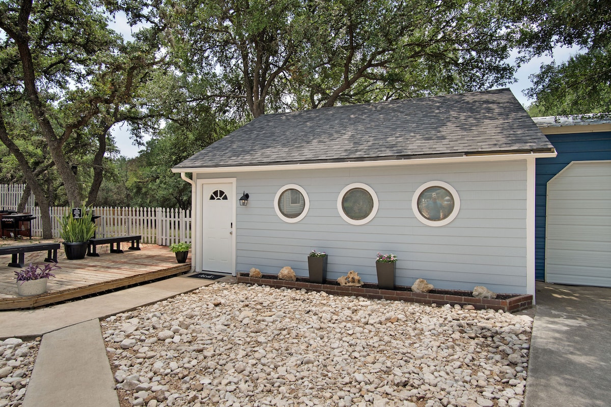 Évadez-vous dans cette paisible petite maison au sommet d'une colline, nichée parmi les chênes sur notre propriété sécurisée de 5 hectares : un endroit idéal pour se détendre et se ressourcer dans le Texas Hill Country. Calme, relaxant et parfaitement situé, vous serez à quelques minutes de New Braunfels et de Canyon Lake, avec le Whitewater Amphitheater et le célèbre tubing de la rivière Guadalupe à seulement 10 minutes (5 miles) environ. Et lorsque vous serez prêt à explorer un peu plus, San Antonio et Austin sont tous deux à une distance facile et pittoresque de votre séjour.