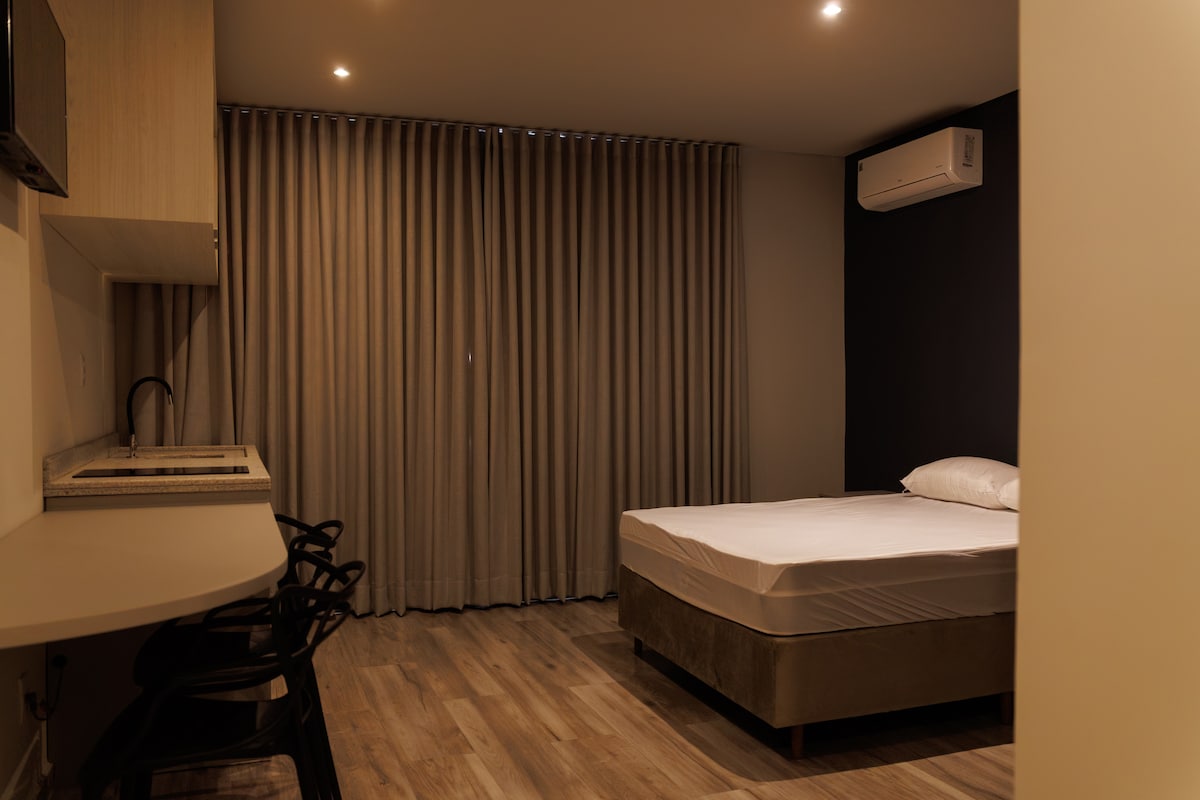 Loft moderne dans le centre-ville de Guarapuava, avec lit queen size, cuisine complète, Wi-Fi, télévision connectée et climatisation chaude et froide. Proche des restaurants, des supermarchés, de la salle de sport et des pharmacies, parfait pour des séjours pratiques et confortables.
