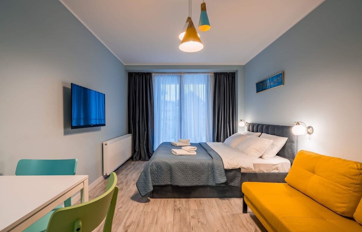 De notre appartement, vous aurez un accès immédiat aux remontées mécaniques dans l'endroit le plus pratique de New Gudauri. L'appartement a été entièrement rénové en tenant compte des détails qui rendent la vie moderne confortable et agréable. Grande chambre avec balcon, cuisine entièrement équipée, coin repas élégant et salle de bains moderne. L'appartement est situé dans le bâtiment « Atrium » avec une piscine intérieure, un restaurant, une terrasse, un parking extérieur gratuit et un accès direct aux pistes principales avec ski-in/ski-out.