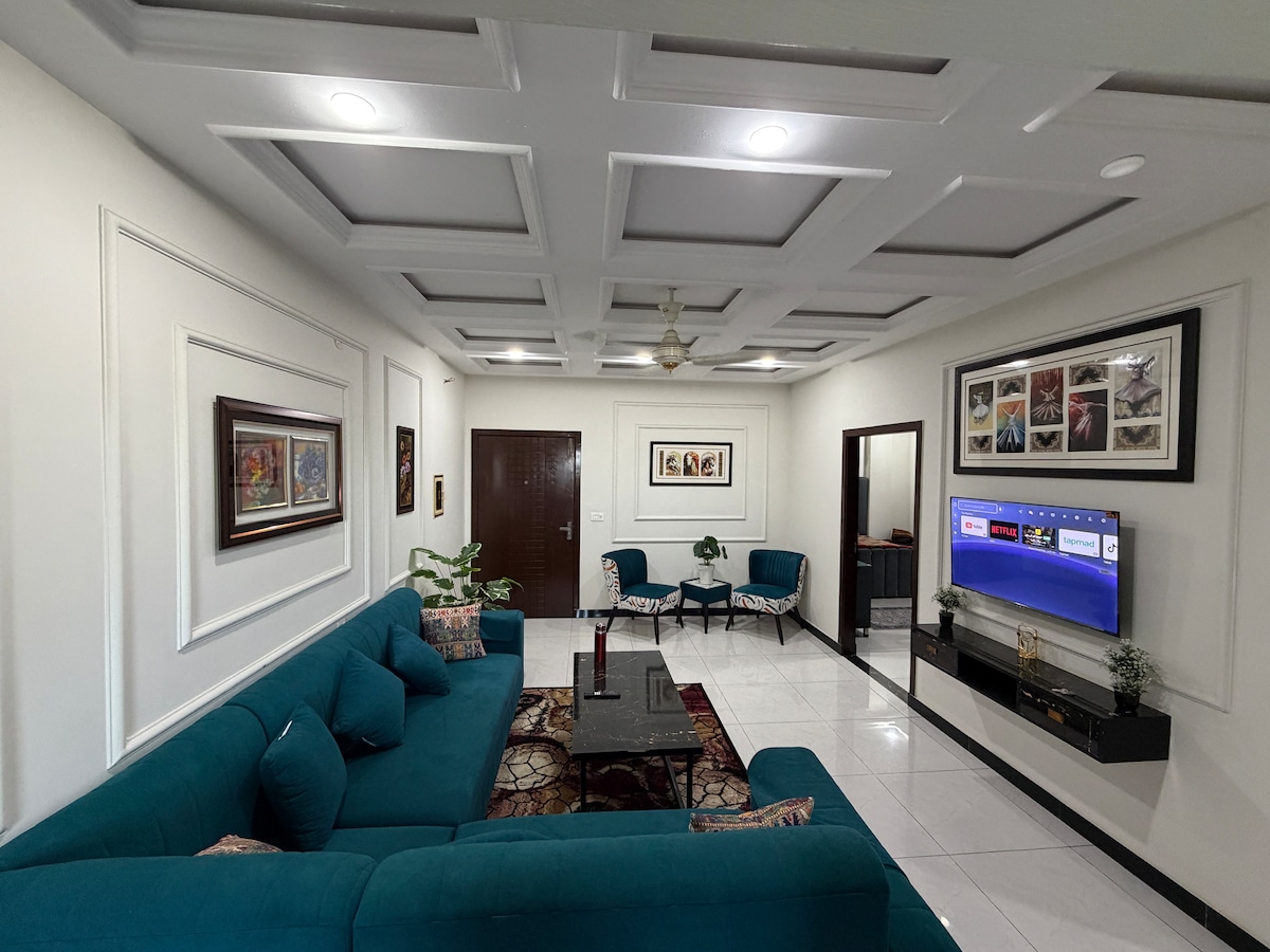 Cet appartement accueillant respire la tranquillité, créant un havre de paix pour les familles. Son ambiance chaleureuse vous embrasse à l'entrée, ce qui favorise instantanément un sentiment de maison. Conçu avec soin, il dégage une atmosphère familiale, ce qui en fait une retraite idéale pour des moments partagés et des souvenirs inoubliables. Détendez-vous avec toute la famille dans ce logement paisible. Autres services : une visite peut être organisée sur demande, 1) Gurdwara Rori Sahib Emanabad 2) Opera Cinema Citi Housing Gujranwala