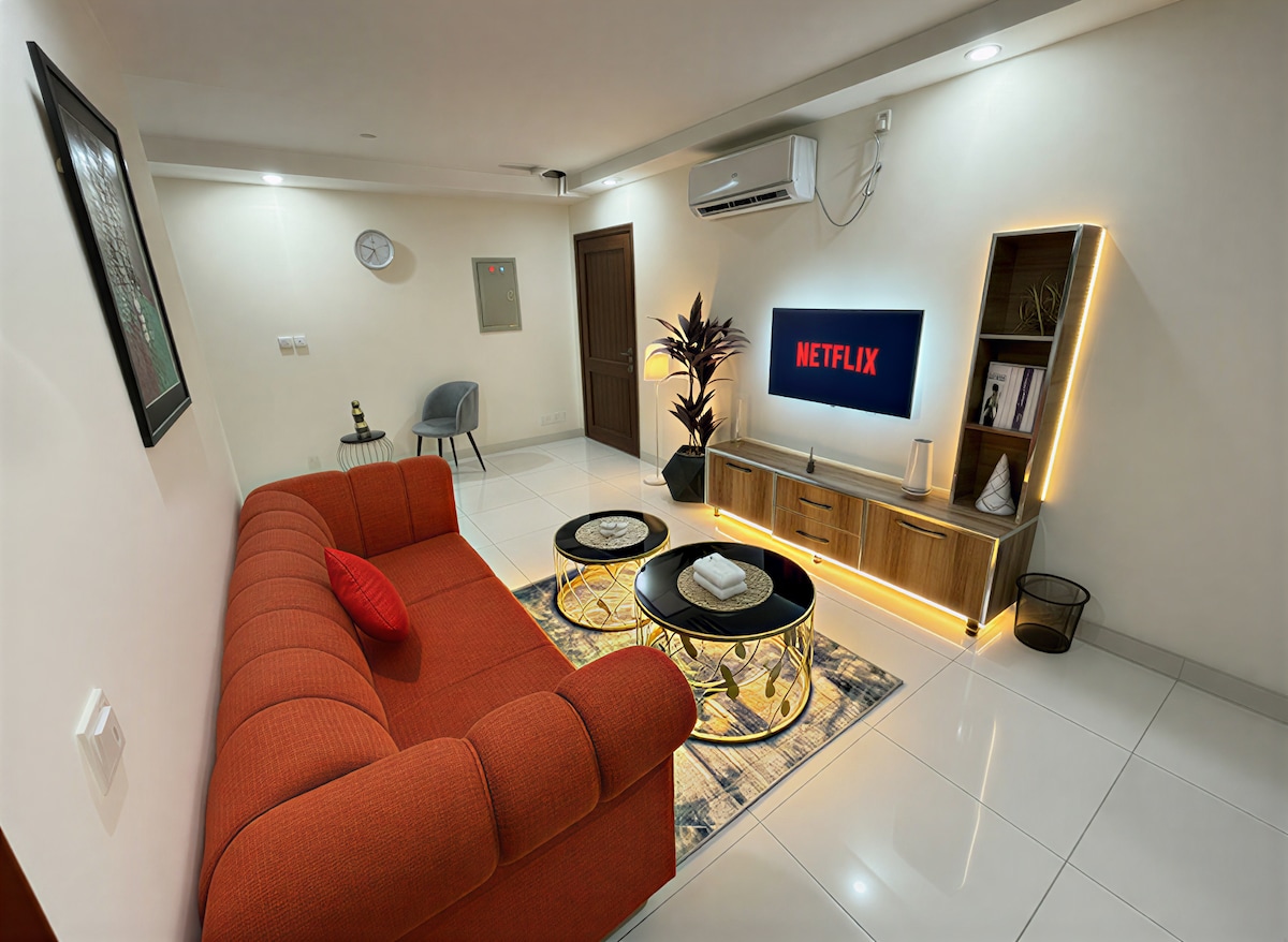 Appartement de luxe dans la DHA Phase 8, à quelques minutes de l'aéroport de Lahore. Parfait pour les familles, les voyages d'affaires et les longs séjours. Profitez d'une connexion Wi-Fi rapide, d'une alimentation de secours, d'un parking sécurisé, d'un ascenseur et d'une cuisine entièrement équipée avec thé, café et collations gratuits. À distance de marche des boutiques, des restaurants et du complexe sportif DHA. Sécurité 24h/24 et 7j/7 pour garder l'esprit tranquille. Propre, au calme et pratique ! Réservez maintenant pour un séjour en douceur et sans stress près de l'aéroport !