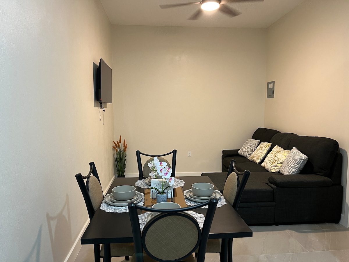 Appartement NEUF ! Entrée indépendante, avec les commodités dans une chambre pour 3 personnes avec A/C, wifi, câble, centre de lavage et de séchage, poêle et réfrigérateur, vaisselle complète, salon, salle à manger, petit déjeuner, salle de bain avec sèche-cheveux, fer à repasser, serviettes et oreiller supplémentaires. NOUS AVONS UNE FACTURE CAI