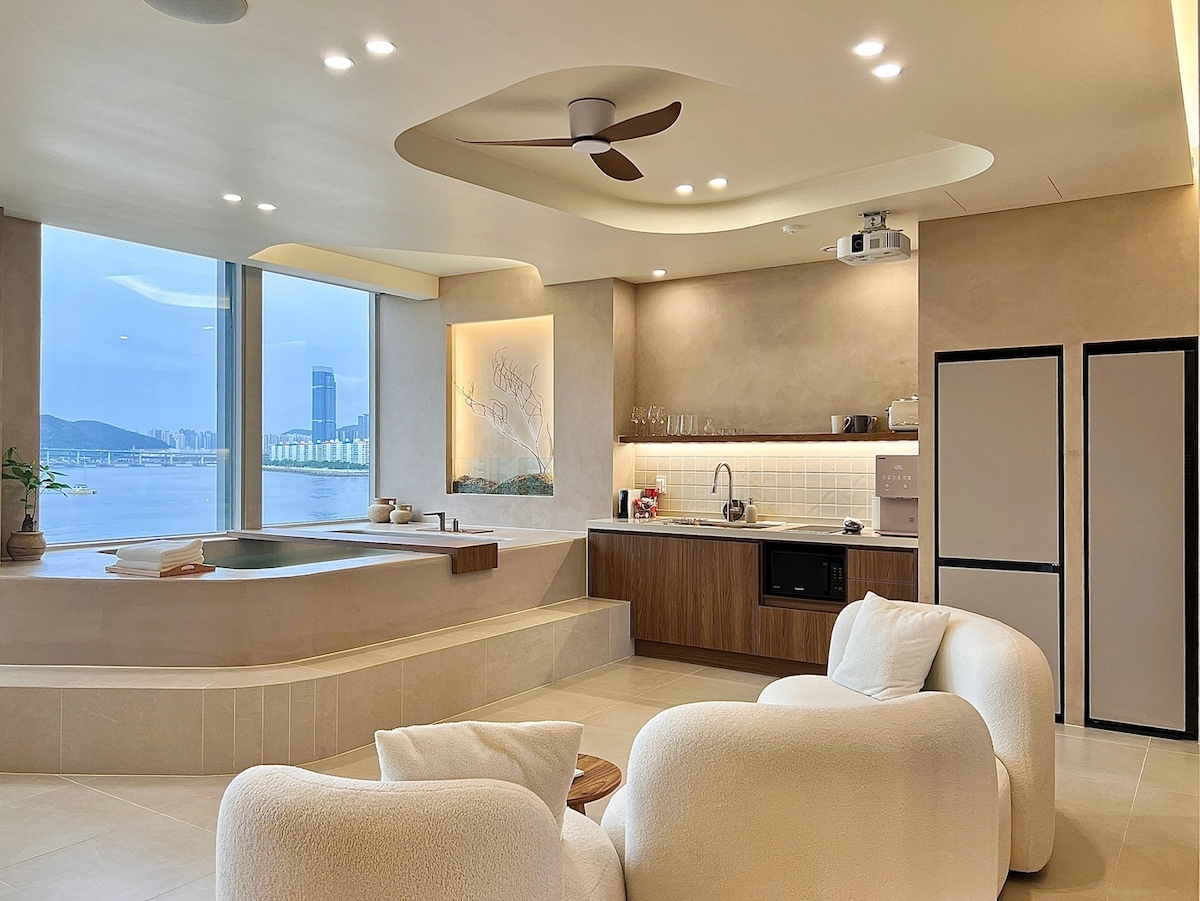 @stay8usanhang est un espace surplombant le port de Busan, soigneusement conçu pour offrir confort et inspiration. Chaque détail, de la musique et du parfum à l'ambiance, à l'intérieur et à la literie, a été soigneusement sélectionné pour agrémenter votre séjour. - Pont de ciel relié à la gare de Busan (5 minutes à pied) -1 lit Super King, 3 super lits simples Baignoire avec vue sur l'océan (spa) - Entièrement équipé / idéal pour les voyageurs en famille Télévision de 50 pouces avec Netflix, YouTube, OTT et chaînes de diffusion Haut-parleurs Bang & Olufsen