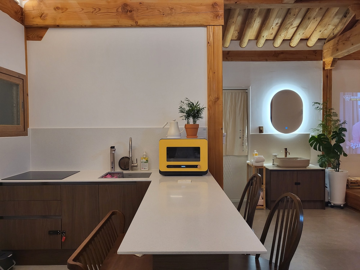 Et si on prenait une machine à remonter le temps pour aller au Sokcho ? Personne ne peut nous trouver Je vais frapper sans réfléchir à la version de la dynastie Joseon Et si on s'imaginait ? Le moment de frapper sans réfléchir est le plus heureux. Aujourd'hui aussi Même si tu es paresseux Je t'aime Je t'encourage. Guéri par la satisfaction aujourd'hui Pour moi qui suis fatiguée et seule pour moi qui suis fatigué et seul. Situé dans le village de hanok à Jeonju Il s'agit d'une maison privée de 5 étoiles de type hanok. Voici les 5 points forts de ce séjour. 1) Fullmung - Une variété de plats adaptés à l'espace et au temps 2) Tdimong - Sauna sec 3) Bulmung - Feu de camp dans une grotte de jacuzzi. Toit en chaume, feu de camp, lampe d'étoile dans la chambre 4) Mungmung - Jacuzzi intérieur. Toit 5) Nolmung - Jeu de yut traditionnel. Jeu d'arcade rétro Ce sont des cadeaux préparés avec soin uniquement pour les cadeaux. * Petits appareils électroménagers de luxe de différentes marques Dyson - Purificateur d'air. Sèche-cheveux. Airwrap Valmuda - Machine à café, grille-pain, haut-parleur Bluetooth Haut-parleur Geneva