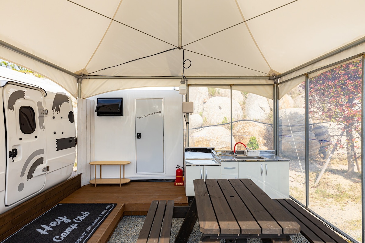 Bonjour, nous sommes Onda, à la recherche et à la fourniture de diverses zones de repos. J'espère que tous ceux qui séjourneront ici profiteront d'un moment confortable et heureux. [Introduction à l'hébergement] Terrain de camping émotionnel avec chiens ! C'est Geoje Dog Campground Camp Village. Il s'agit d'un logement récemment ouvert depuis 24 ans, et c'est une caravane en bois. :) Il y a un espace barbecue individuel qui peut également être utilisé par temps pluvieux. [Type de chambre] Type de studio (1 double, 1 simple + 1 toilette) * La literie est fournie en fonction du nombre de personnes que vous avez réservées.