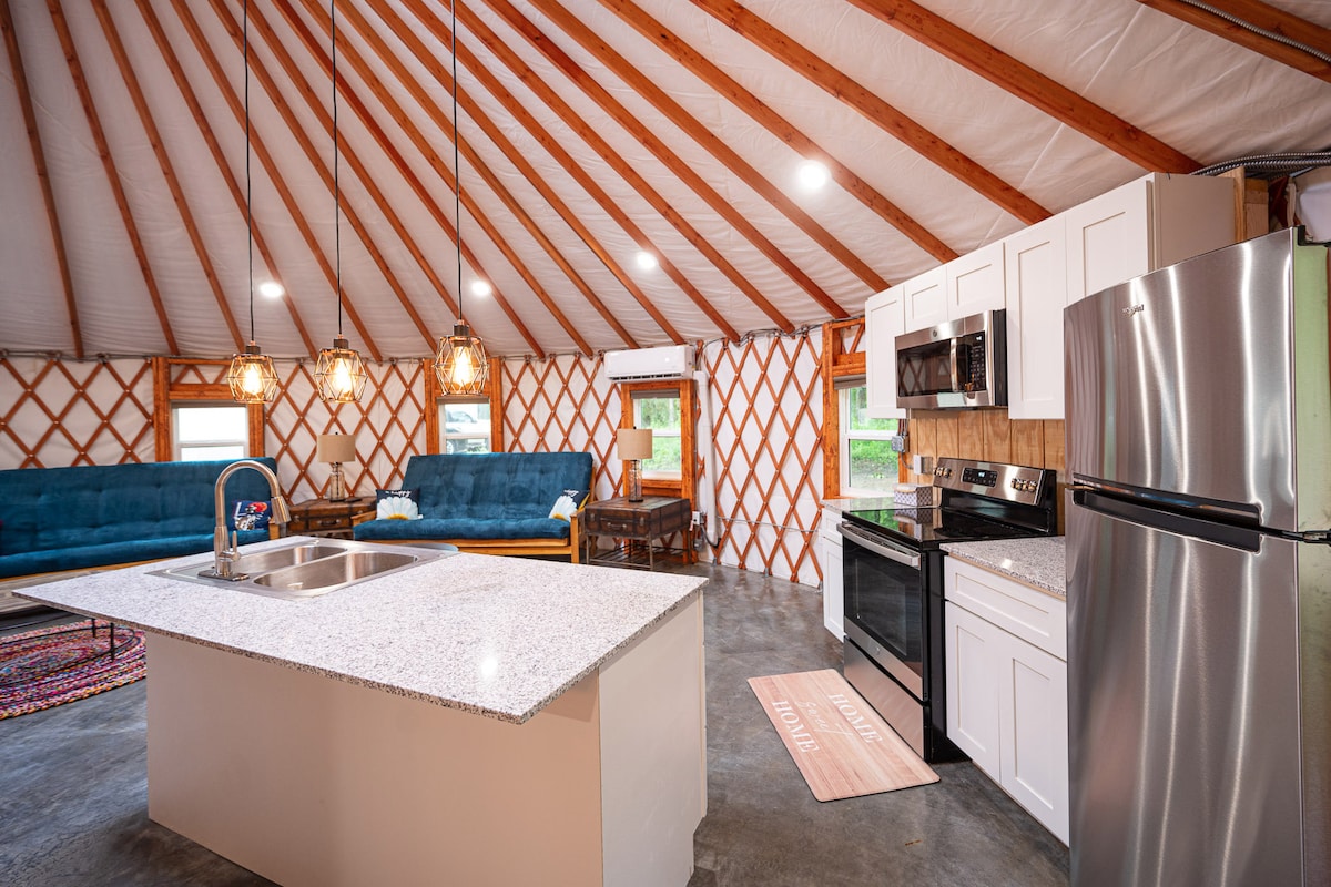 YURTE de 30 pieds avec un loft et tout le luxe d'une maison (y compris le CHAUFFAGE et la CLIMATISATION) ! Cet espace unique est situé sur notre ferme de 50 acres avec des kilomètres de sentiers et beaucoup d'intimité. Ce n'est pas une tente ordinaire ! C'est le meilleur du glamping avec une cuisine complète, une plomberie régulière, la climatisation et tout le confort d'un chez-soi. N'oubliez pas que nous l'annonçons comme ayant 2 chambres, mais la 2e chambre est un loft ouvert et non privé. Vous allez adorer votre séjour dans la MÉGA yourte de Maggie !