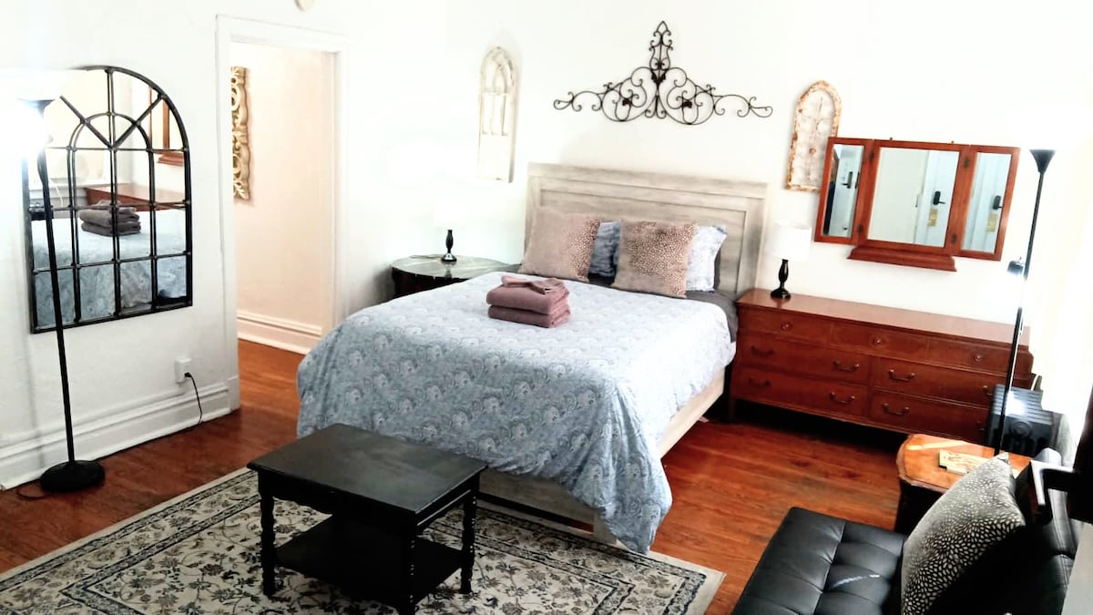 Tout d'abord, consultez nos 4 annonces privées 5 étoiles qui combinent de manière créative l'ancien avec le nouveau. Si l'un d'eux n'est pas disponible, vérifiez les autres en accédant à « Mon profil » et en faisant défiler la page vers le bas jusqu'à ce que vous voyiez les 4. Ce bâtiment historique, construit en 1896, a changé de missions au fil des ans ; d'église à marchand. de commerce, à épicerie ; toute l'histoire a orné ces murs. Vous apprécierez notre quartier sûr de Southwest Gardens ; à côté de la célèbre « Hill » qui offre des restaurants, des magasins et des boulangeries inégalés.