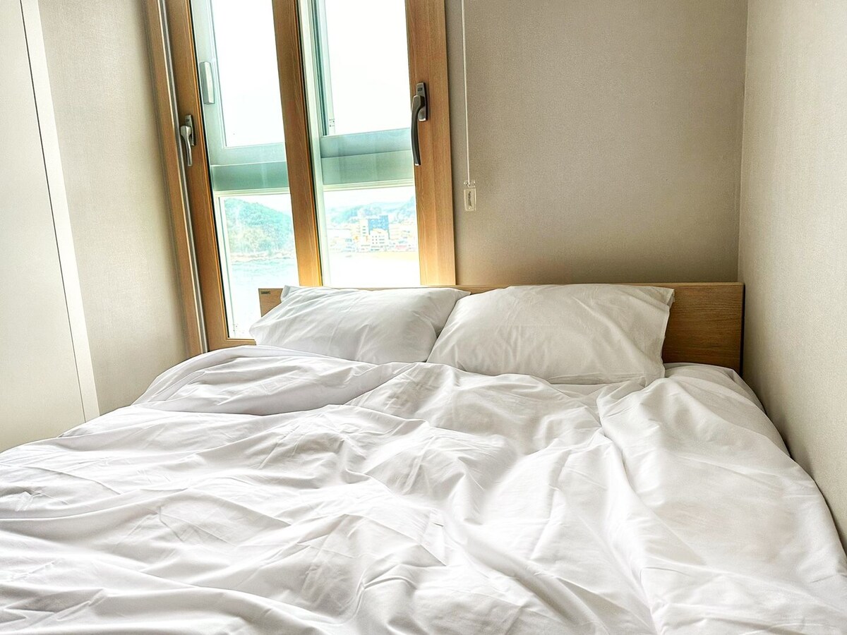 🥭C'est Mangone. La seule chambre pour 4 personnes Le bar-terrasse offrira aux clients la meilleure vue sur l'océan🏖️ et🧋 le lieu de dégustation de thé le plus délicieux. La plage est à 10 secondes du hall de l'immeuble,🏝️ et il y a des magasins de proximité à côté de l'immeuble. Il s'agit d'une chambre double avec un lit king size dans la première chambre et un lit queen size dans la deuxième chambre, ainsi qu'un grand lit premium🛏️ pour un sommeil confortable.💟 Dans le salon, il y a une table à manger🍽️ pour 4 personnes Thé et collations, vin, whisky, etc. Disponible (vin. whisky. verre de soju) est prêt. Les ustensiles de cuisine sont prêts. Les choses qui ne sont pas possibles Griller de la viande (viande crue) La viande grillée est possible. Poisson maeuntang, crabe, etc. L'odeur de poisson ne disparaît pas. Nous vous prions de bien vouloir comprendre que cela n'est pas possible pour les clients Toute la chambre a une vue sur l'océan et vous pouvez également profiter de la vue sur l'océan depuis la fenêtre du salon à la table🌊 à manger~ Le lever du soleil🌅 peut être apprécié depuis le salon de la première chambre sur la terrasse de la chambre. Alors je vous verrai bientôt🙏🏻