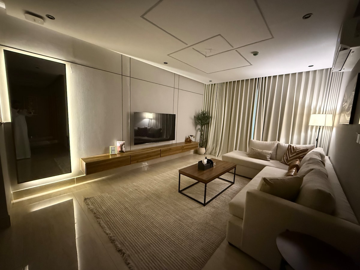 Découvrez un séjour unique dans un appartement confortable au cœur de Khobar. L'appartement dispose de nombreux équipements : 1. Entrée intelligente et sécurisée par une serrure de porte intelligente. 2. Grand espace de salon confortable pour la famille. 3. Une grande cuisine intégrée avec des ustensiles de cuisine et des ustensiles. 4. Écran intelligent 4K. 5. Connexion internet 5G rapide. 6. Un parking privé L'appartement est à proximité de nombreuses attractions, notamment : 1. Pont de Bahreïn - À moins de 5 min 2. Centre commercial Al Rashed - 10 min. 10 min. 3. Bord de l'eau - 5 min.