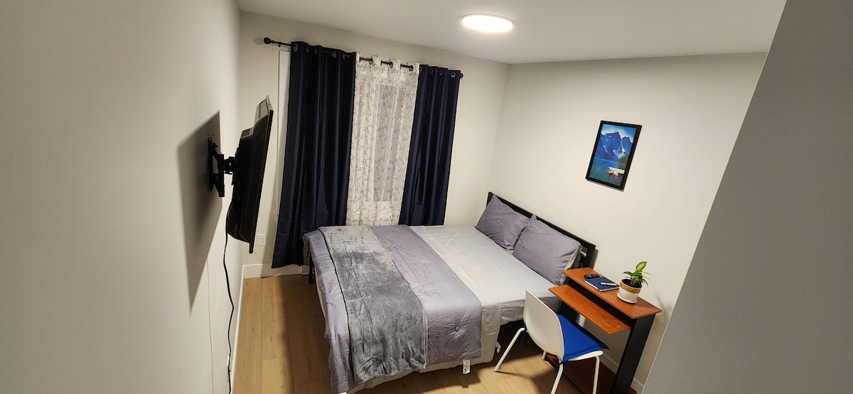 Un appartement lumineux et ensoleillé au deuxième étage, idéalement situé au centre-ville d'Halifax. Dal, SMU et hôpitaux, à 10-15 min à pied. Lit king size (possibilité de 2 lits simples sur demande pour les séjours plus longs). Lave-linge/sèche-linge Salle de bain privée avec baignoire et douche Kitchenette : double évier - micro-ondes - réfrigérateur - plaque chauffante, friteuse à air, cafetière pour café moulu. Climatisation/pompe à chaleur Roku TV disponible pour les applications personnelles.