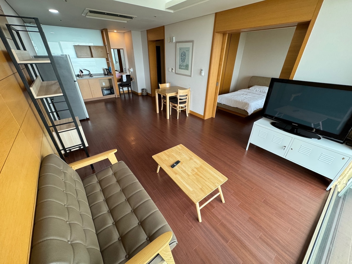 Basique 2 personnes / Max 4 personnes (C'est une baignoire sans fonction spa.) Chambre + Salon + Cuisine + Salle de bain (Baignoire pour 2 personnes) + Balcon Télévision murale de 40 pouces, WIFI FRee, système de climatisation, réfrigérateur, four à micro-ondes, cuisinière, cuiseur à riz, cafetière, ensemble de vaisselle, sèche-cheveux, shampoing combiné, nettoyant pour le corps * Pour fournir un environnement agréable, l'utilisation de poêles à frire est interdite. (Statut du taux de vacance x)