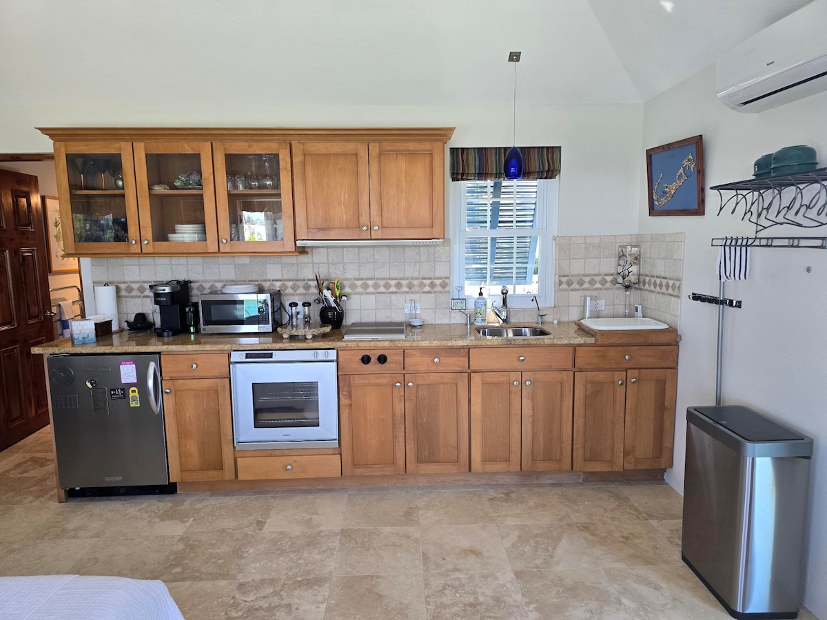 Cet appartement est entièrement meublé et dispose d'un lit Queen Size + d'un lit pliant + d'un lit gonflable adapté pour une personne supplémentaire. Il est situé à 2/3 miles de l'aéroport. Il possède son propre porche privé dans un jardin. À proximité se trouvent les grottes de Crystal, le parc Blue Hole, le Swizzle Inn, l'hôtel Grotto Bay, le sentier ferroviaire/piétonnier, le glacier, un dépôt de vélos, un dépanneur à proximité et plusieurs itinéraires de bus panoramiques vers la ville de Hamilton et les plages populaires.