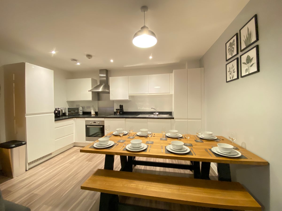 Ce superbe appartement de luxe en centre-ville est situé au cœur de Basingstoke. Avec un mobilier moderne et confortable, une cuisine entièrement équipée avec lave-vaisselle, réfrigérateur congélateur et lave-linge sécheur. Il y a un téléviseur HD Smart TV avec freeview, Amazon/Netflix et des services de streaming web. Une connexion Wi-Fi haut débit est disponible en standard et un nettoyage professionnel de sortie est inclus dans tous les séjours. Pour les séjours de plus de 7 nuits, le nettoyage hebdomadaire est inclus.