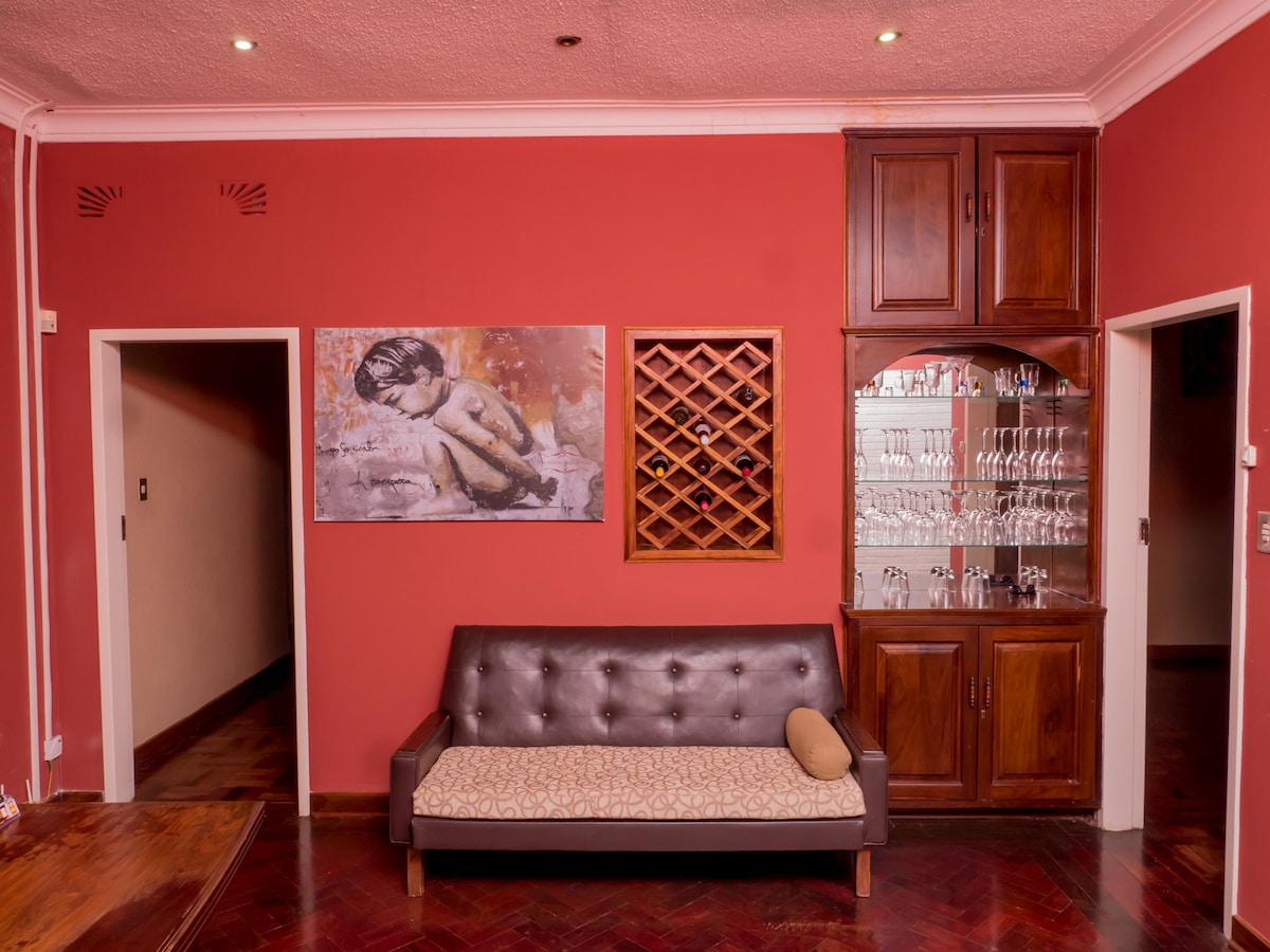 Cette suite confortable est meublée dans un style classique et essentiel. Profitez d'équipements pratiques dans la chambre, y compris un lit queen size, une connexion Wi-Fi gratuite, une télévision par satellite de 42 pouces, une salle de bain privée moderne entièrement équipée, un micro-ondes et un bar réfrigérateur. Rajeunie avec des coups de couleur et un confort audacieux pour compléter l'énergie fraîche pour votre hygiène de sommeil et votre plaisir, cette suite est l'une (1) des six (6) chambres bien aménagées situées à The Hilltop Guesthouse dans le cadre calme d'Emerald Hill Harare Zimbabwe.