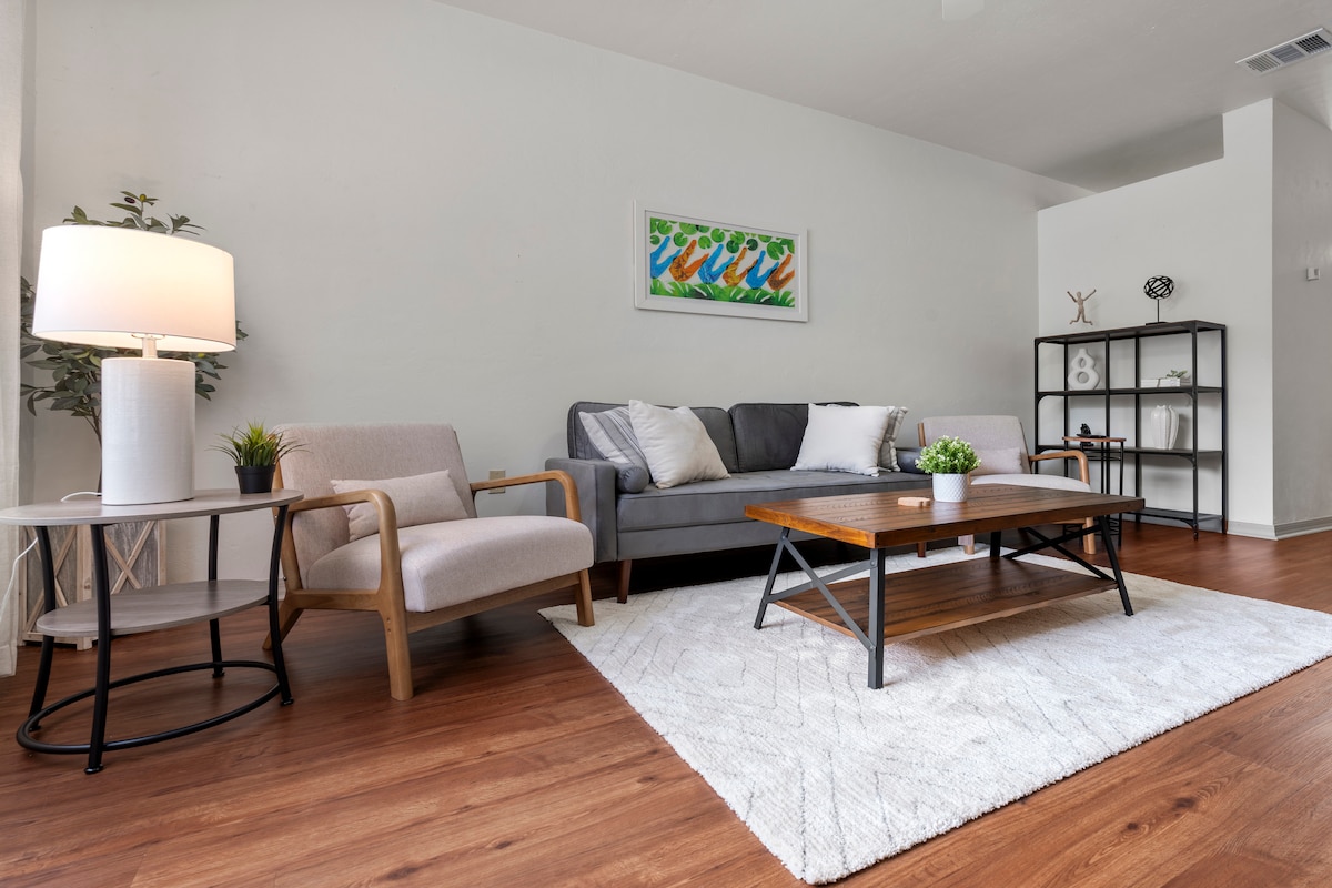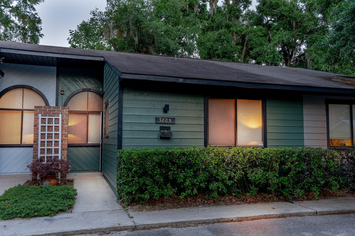 Un refuge adorable et charmant de 2 chambres/2 salles de bain, lumineux, aéré, calme et acceptant les animaux de compagnie ! Valeur ☀️ sûre située au cœur de tout ce que Gainesville a à offrir. Plan ☀️ d'étage double (lits KING) avec espaces de vie centraux Arrière-cour ☀️ privée entièrement clôturée. ☀️ Guirlandes lumineuses et foyer privé ☀️ Plafonds voûtés et cuisine bien équipée Matelas et draps☀️ haut de gamme et confortables Wi-Fi ☀️ haut débit pour le télétravail ☀️ Plain-pied, pas d'escaliers ☀️ ANIMAUX ACCEPTÉS À ☀️ 2 miles de l'UF, du stade Ben Hill et de Shands