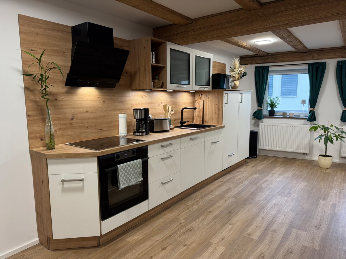 Appartement de vacances spécial dans un moulin classé entre champs et vergers. 80 m² avec 2 chambres dans une cour à colombages de 500 ans rénovée dans un endroit isolé au bord de la rivière. Équipement de haute qualité, cuisine et salle de bain modernes, souci du détail et rénové en 2016/17 selon les principes de la biologie du bâtiment.