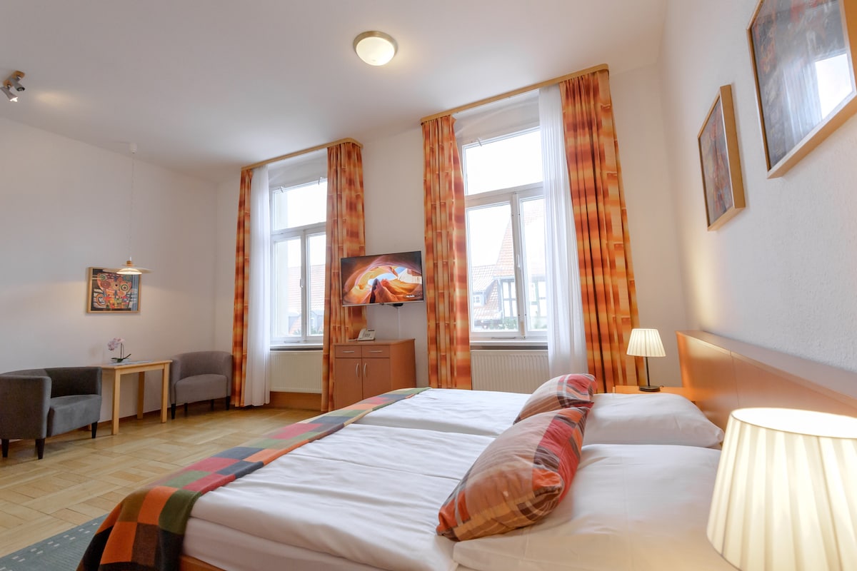 Grand et calme. 3 minutes à pied de la magnifique Marktplatz de Quedlinburg. Les salles de bains modernes ne répondent à rien. La grande salle à manger vous offre suffisamment d'espace et le balcon donnant sur la cour intérieure vous invite à vous attarder. Si vous n'êtes pas encore épuisé par la randonnée dans le Harz, vous pouvez brûler le reste de l'énergie dans la salle de fitness. Nous serons heureux de vous accueillir.