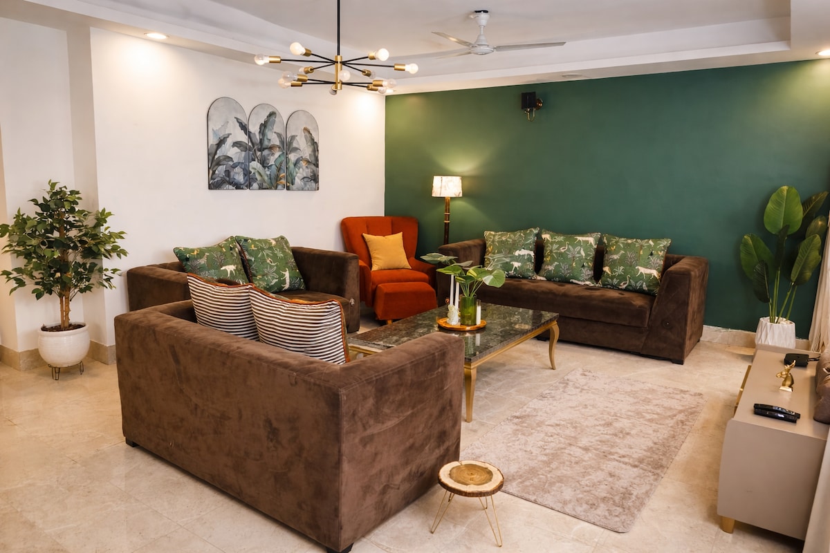 Séjournez dans notre spacieuse retraite de 2 chambres avec vue sur le parc, à 8,5 km des aéroports et à 15 min en voiture du métro. Profitez de balcons aérés, de vues sur le parc, de lits en acajou/bois, d'une cuisine entièrement équipée, d'une connexion Wi-Fi haut débit, d'une télévision connectée, d'articles de toilette gratuits et de recommandations locales. Savourez des repas faits maison, explorez le marché et les centres commerciaux à proximité et détendez-vous sur les pistes de jogging sereines. Découvrez une hospitalité haut de gamme avec une arrivée et un départ flexibles, des services de blanchisserie et des transferts aéroport en option. Réservez dès maintenant pour un séjour inoubliable à Delhi !