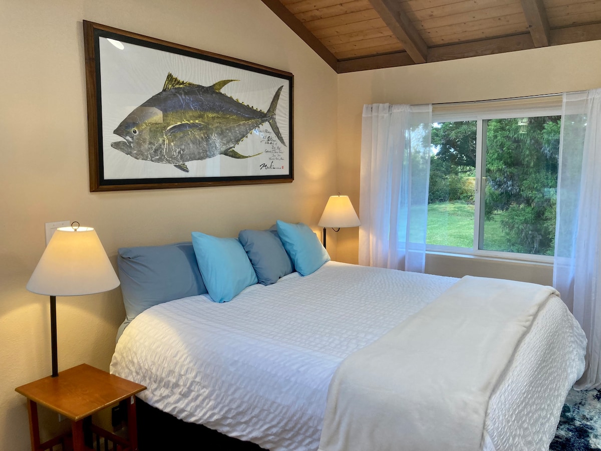 Profitez de la paisible forêt tropicale au cœur du village de Volcano et explorez le parc national des volcans d'Hawaï à quelques minutes. Il s'agit d'une chambre principale de 1 000 pieds carrés (94 m²) avec une entrée privée. La chambre dispose de grandes fenêtres et de portes-fenêtres doubles qui s'ouvrent sur le paysage verdoyant à l'extérieur. La propriété est sécurisée par une porte d'entrée et il y a un parking réservé aux voyageurs. Nous sommes également à distance de marche de plusieurs restaurants, magasins généraux et du marché fermier du dimanche.