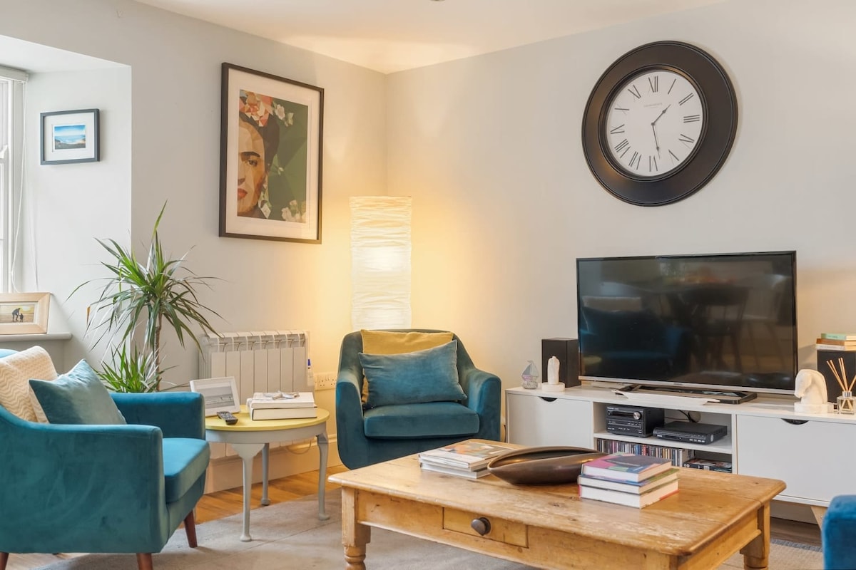 A charming and pretty, south-facing apartment located in one of the most sought after areas of Penzance. Situated in a quiet and picturesque grade 2 listed Regency terrace, surrounded by gardens, parks and trees; close to the centre of town and a 5 minute stroll to the promenade. Sky Blue is an ideal base from which to explore the spectacular scenery of West Penwith. Tea, coffee, milk and a Cornish cream tea is on the table for when you arrive! There is a private parking space for your car.