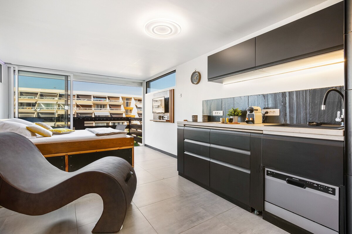 Cosy studio très lumineux, face à la mer de 17m² climatisé au centre d'Héliopolis H au 4ème et dernier étage avec terrasse de 5m² vue mer. Les ++ ✔ Climatisation. ✔ Vue mer. ✔ Pas de frais de service. ✔ Refait à neuf en 2022. ✔ Internet par la fibre et télévision connectée. ✔ Draps, serviettes de toilettes, serviettes de plage fournis. ✔ Nécessaire pour vos petits déjeuners à votre arrivée : café, thé, chocolat. ✔ Place de parking privé sécurisée sur le P1-124