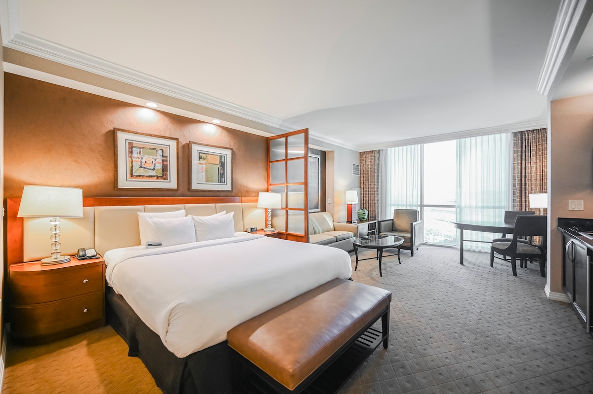 Cette suite studio de 631 pieds carrés est entièrement équipée et parfaite pour les personnes ou les petits groupes qui veulent vivre l'expérience Vegas tout en profitant des commodités d'une maison. Ce studio luxueux est à la fois spacieux et accueillant avec une vue incroyable. Ce studio peut accueillir jusqu'à 4 personnes avec un lit King Size et un canapé-lit gigogne complet. • PAS DE FRAIS DE CENTRE DE VILLÉGIATURE • Wi-Fi gratuit. • Accès à la piscine et au centre de remise en forme • À distance de marche du Las Vegas Strip et de TopGolf • Parking gratuit.
