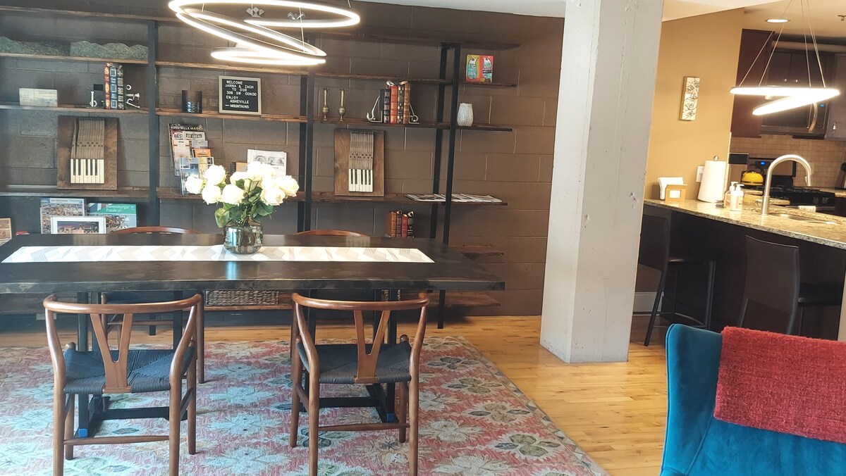Top 5 % Airbnb !!! Géré localement ! Merci de considérer notre logement situé au cœur du centre-ville ! Doté de l'icade Pac-Man avec tous vos jeux préférés des années 80. Notre élégant appartement est rempli de touches élégantes et modernes, et d'art local d'Asheville. Nous sommes à distance de marche de tout ce qu'Asheville a à offrir, y compris certains des restaurants préférés de la ville comme Curate, Limones et Wicked Weed. De plus, nous avons une place de stationnement gratuite !