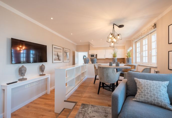 Notre belle villa d'architecture de salle de bain classée a été construite en 1896. En 2000, toute la villa a été entièrement rénovée avec beaucoup d'amour du détail. Tous les appartements sont dernier cri et confortables. Trois des cinq appartements disposent d'un balcon ou d'une terrasse. Les appartements des 2e et 3e étages sont également accessibles par un ascenseur. - Stationnement inclus - ascenseur - Adapté aux familles - Accessible partiellement aux fauteuils roulants - Serviettes incluses - Linge de lit inclus - Carte de spa incluse - Loft spacieux sur deux étages - à seulement 50 m de la plage - Vue mer au premier rang avec trois balcons et sauna privé - Équipement haut de gamme et cuisine professionnelle Arrivez et profitez ! Vous allez adorer notre loft spacieux sur l'île (environ 220 m ²). Sur une largeur de 4 mètres, vous avez une façade de fenêtre donnant sur la mer Baltique. Si la météo le permet, vous pouvez ouvrir les fenêtres sur toute la largeur. Vous pourrez également profiter de la superbe vue sur la mer depuis le sauna et la cuisine. La cuisine est un cours à lui seul. Équipé d'appareils professionnels de Gaggenau et de beaucoup d'espace pour de nombreuses mains d'assistance. Asseyez-vous avec votre famille ou vos amis à la table spacieuse et dégustez un délicieux expresso de la cafetière entièrement automatique après le dîner. Sur l'un des trois balcons du grenier, vous trouverez toujours un bel endroit. Et si le temps n'est pas si beau, asseyez-vous simplement dans un fauteuil en cuir anglais confortable et regardez simplement la mer Baltique ou la belle cheminée. À l'étage inférieur du loft de l'île (1er étage), il y a deux chambres avec lits doubles et une vue magnifique sur la mer. Les deux chambres sont bien sûr équipées d'une télévision. Une chambre dispose d'une salle de bain attenante, ce qui ne laisse rien à désirer. Une grande douche à l'italienne avec douche au plafond est à votre disposition ainsi qu'une magnifique baignoire. Un canapé dans la salle de bain vous invite à vous sentir à l'aise.