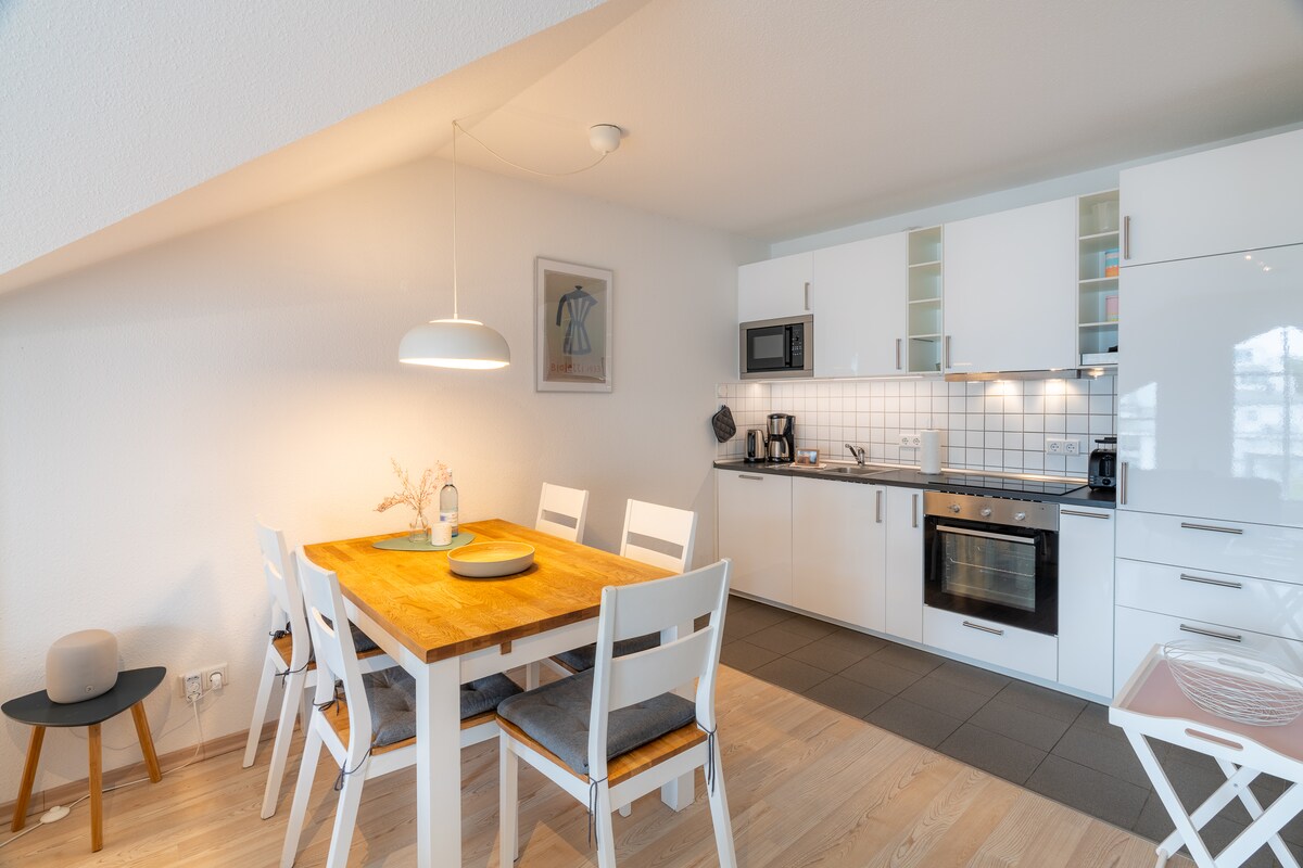 Refuge romantique de première classe Le nid douillet, surplombé par un plafond historique en briques, se trouve au rez-de-jardin de la Villa Meeresstern, un bâtiment historique classé datant de l'avant-dernier siècle. Les locaux uniques, récemment rénovés - composés d'un grand loft de vie et de couchage, d'une cuisine, d'une salle de bain complète et d'une garde-robe séparée - offrent un mélange fascinant d'histoire et de contemporain qui ravira les amateurs de design.